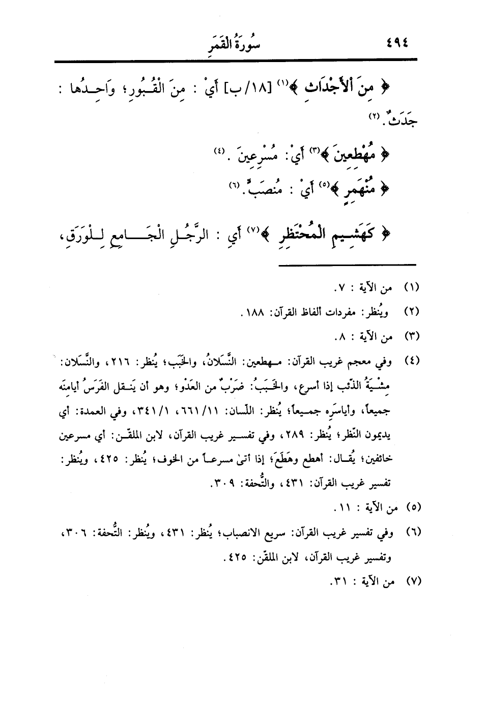 {من الأجداث} أَي: من الْقُبُور، وَاحِدهَا: جدث. {مهطعين} أَي: مُسْرِعين. {منهمر} أَي: منصب. {كهشيم المحتظر} أَي: الرجل الْجَامِع للورق،