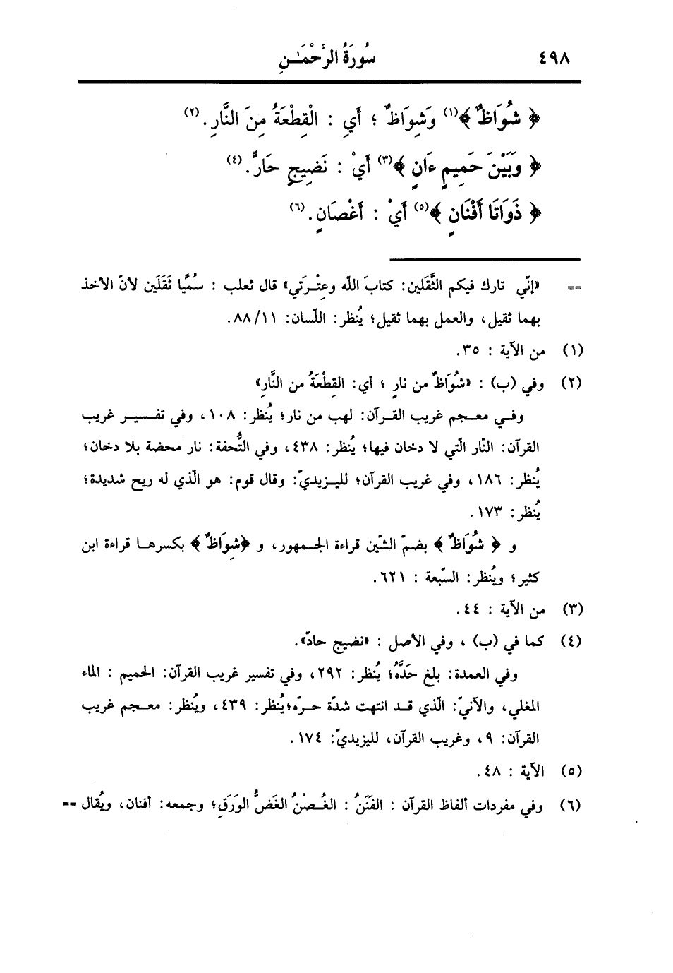 {شواظ} وشواظ، أَي: الْقطعَة من النَّار. {وَبَين حميم آن} أَي: نضيج حَار. {ذواتا أفنان} أَي: أَغْصَان.