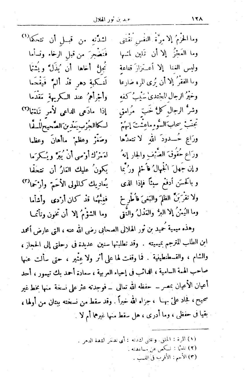 وهذه ميمية حميد بن ثور الهلالي الصحابي رضي الله عنه، التي عارض امحمد ابن الطلب المترجم بميميته. وقد تطلبتها سنين عديدة في رحلتي إلى الحجاز، والشام، والقسطنطينية. فما وقفت لها على أثر ولا عثير، حتى سألت عنها صاحب الهمة السامية، الدائب في إحياء العربية، سعادة أحمد بك تيمور، أحد أعيان الأعيان بمصر - حفظه الله تعالى - فوجدته عثر على نسخة منها بخط غير صحيح، فجاد عليّ بها، جزاه الله خيرا. وقد سقط من نسخته بيتان من أولها، بقيا في حفظى، وما أدري، هل سقط منها غيرهما أم لا.