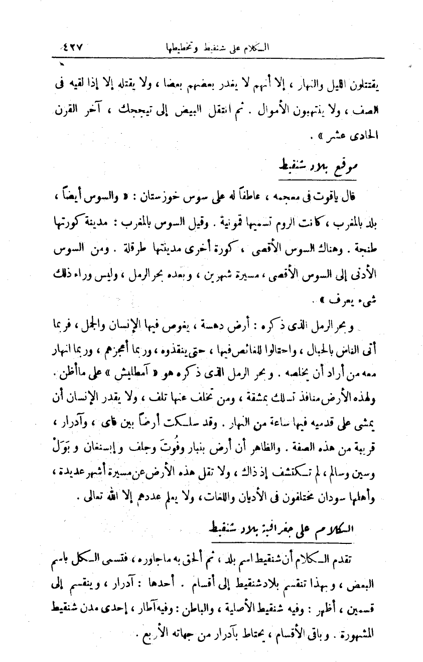 معه من أراد أن يخلصه. وبحر الرمل الذي ذكره هو (آمطليش) على ما أظن. ولهذه الأرض منافذ تسلك بمشقة، ومن تخلف عنها تلف، ولا يقدر الإنسان أن يمشي على قدميه فيها ساعة من النهار. وقد سلكت أرضا بين فاي، وآدرار، قريبة من هذه الصفة. والظاهر ان أرض بنبار وفُوت وجلف وإيسنغان وبول وسين وسالم، لم تكتشف إذ ذك، ولا تقل هذه الأرض عن مسيرة أشهر عديدة، وأهلها سودان مختلفون في الأديان واللغات، ولا يعلم عددهم إلا الله تعالى.