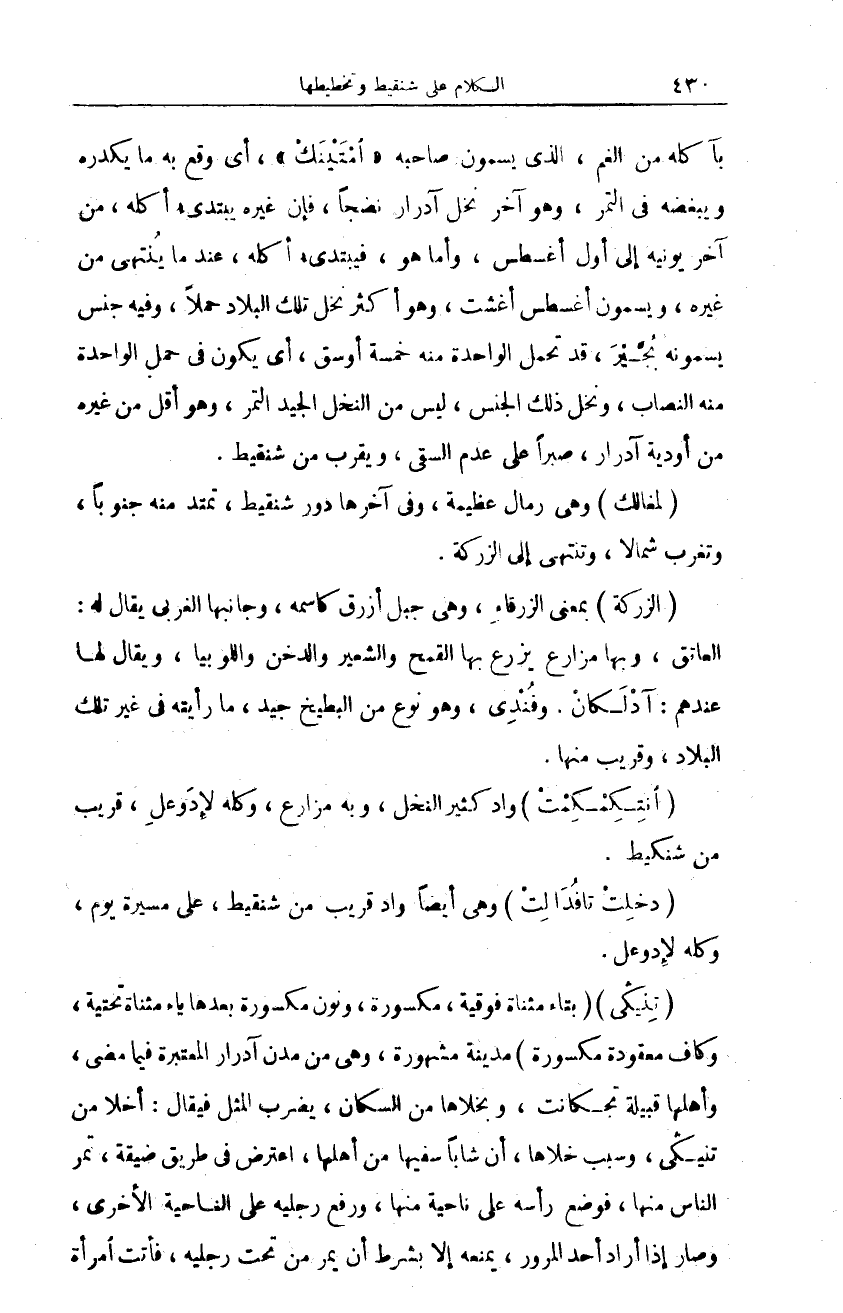 بآكله من الغم، الذي يسمون صاحبه (امْتَيْنَكْ)، أي وقع به ما يكدره ويبغضه في التمر، وهو آخر نخل آدرار نضجا، فغن غيره يبتدئ أكله، من آخر يونيه إلى أول أغسطس، وأما هو، فيبتدئ أكله، عندما يُنتهى من غيره، ويسمون أغسطس أغشت، وهو أكثر نخل تلك البلاد حملا، وفيه جنس يسمونه بُجَّيْرَ، قد تحمل الواحدة منه خمسة أوسق، أي يكون في حمل الواحدة منه النصاب، ونخل ذلك الجنس، ليس من النخل الجيد التمر، وهو أقل من غيره من أودية آدرار، صبرا على عدم السقي، ويقرب من شنقيط.