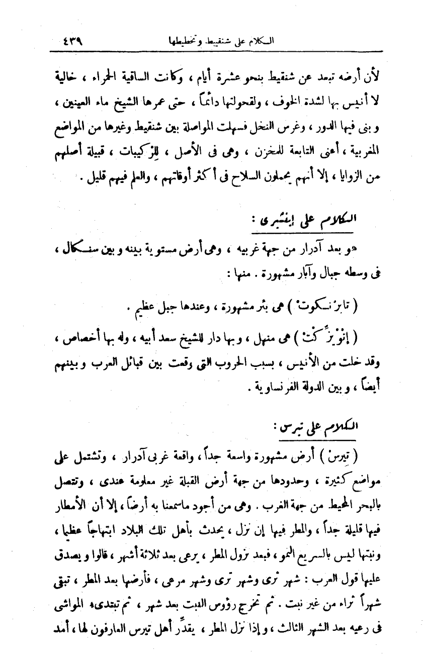 (تِيرسْ) أرض مشهورة واسعة جدا، واقعة غربي آدرار، وتشتمل على مواضع كثيرة، وحدودها من جهة أرض القبلة غير معلومة عندي، وتتصل بالبحر المحيط من جهة الغرب. وهي من أجود ما سمعنا به أرضا، إلا أن الأمطار فيها قليلة جدا، والمطر فيها ان نزل، يحدث بأهل تلك البلاد ابتهاجا عظيما، ونبتها ليس بالسريع النمو، فبعد نزول المطر، يرعى بعد ثلاثة أشهر، قالوا ويصدق عليها قول العرب: شهر ثرى وشهر ترى وشهر مرعى، فأرضها بعد المطر، تبقى شهرا ثراء من غير نبت. ثم تخرج رؤوس النبت بعد شهر، ثم تبتدئ المواشي في رغيه بعد الشهر الثالث، وإذا نزل المطر، يقدِّر أهل تيرس العارفون لها، أمد