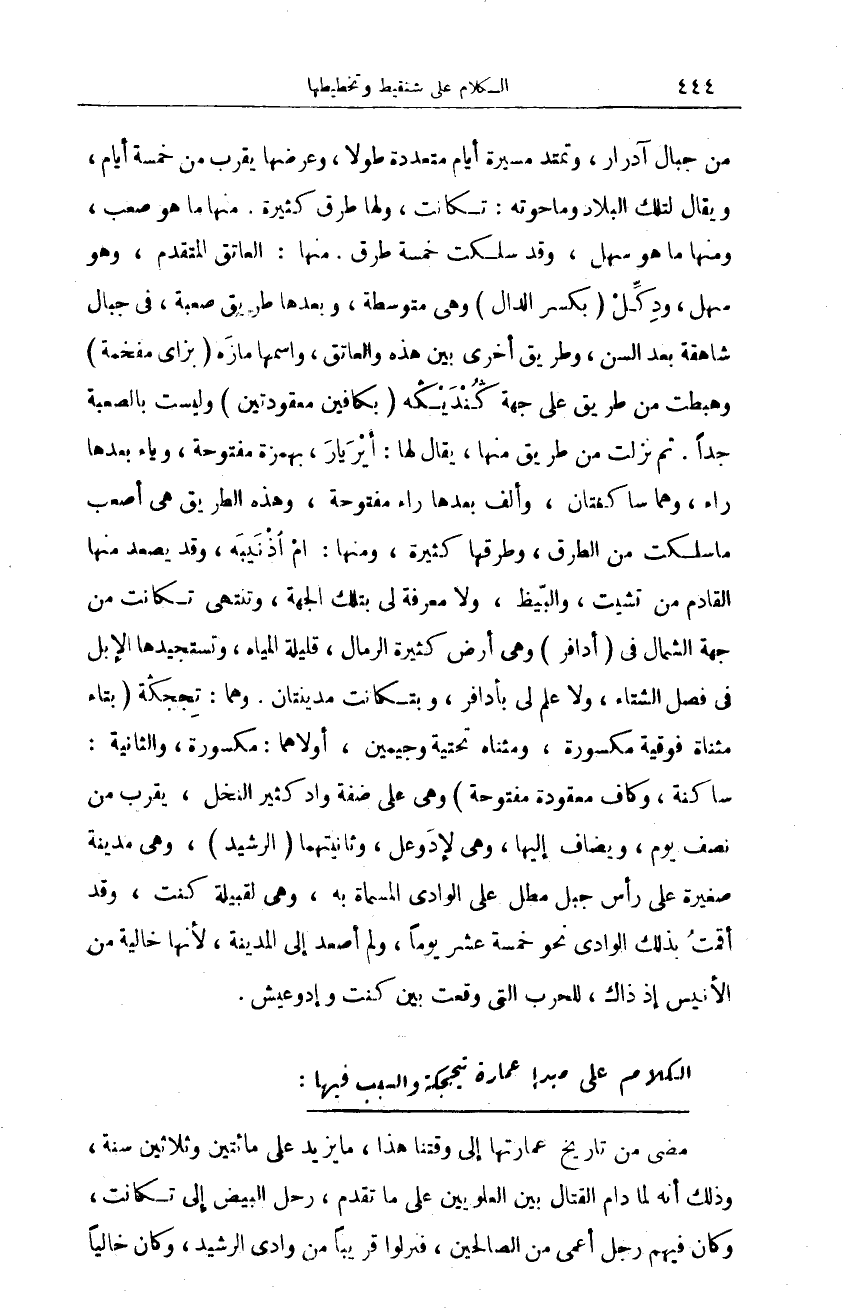 من نصف يوم، ويضاف إليها، وهي لإدَوعل، وثانيتهما (الرشيد)، وهي مدينة صغيرة على رأس جبل مطل على الوادي المسماة به، وهي لقبيلة كنت، وقد أقمت بذلك الوادي نحو خمسة عشر يوما، ولم أصعد إلى المدينة، لأنها خالية من الأنيس إذ ذاك، للحرب التي وقعت بين كنت وإدوعيش.