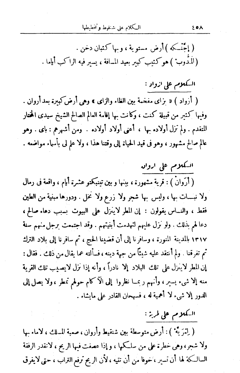 (أرَوانْ): قرية مشهورة، بينها وبين تينبكتو عشرة أيام، واقعة في رمال ولا نبات بها، وليس بها شجر ولا زرع ولا نخل. ودورها مبنية من الطين فقط، والناس يقولون: إن المطر لا ينزل على البيوت بسبب دعاء صالح، دعا لهم بذلك، ولو نزل عليهم لتهدمت أبنيتهم. وقد اجتمعت برجل منهم سنة 1317 بالمدينة المنورة، وسافرنا إلى أن قضينا الحج، ثم سافرنا إلى بلاد الترك ثم تفرقنا. ولم أنتقد عليه شيئا من جهة دينه، فسألته عما يقال من ذلك. فقال: إن المطر لا ينزل على تلك البلاد إلا نادرا، وأنه إذا نزل لا يصيب تلك القرية منه إلا شيء يسير، وأنهم ربما نظروا إلى الآكام حولهم تمطر، ولا يصل إلى الدور إلا شيء لا أهمية له، فسبحان القادر على ما يشاء.