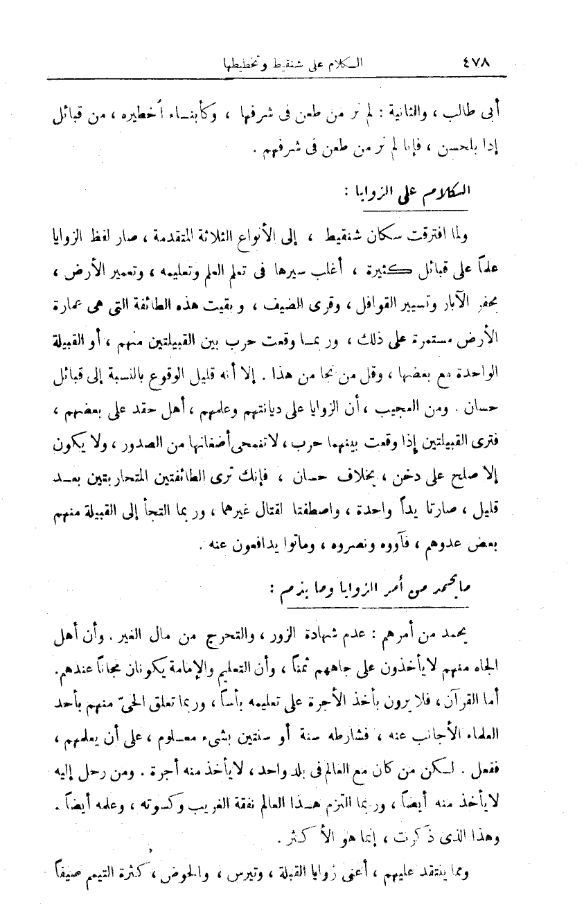 ولما افترقت سكان شنقيط، إلى الأنواع الثلاثة المتقدمة، صار لفظ الزوايا علما على قبائل كثيرة، أغلب سيرها في تعلم العلم وتعليمه، وتعمير الأرض، بحفر الآبار وتسيير القوافل، وقرى الضيف، وبقيت هذه الطائفة التي هي عمارة الأرض مستمرة على ذلك، وربما وقعت حرب بين القبيلتين منهم، أو القبيلة