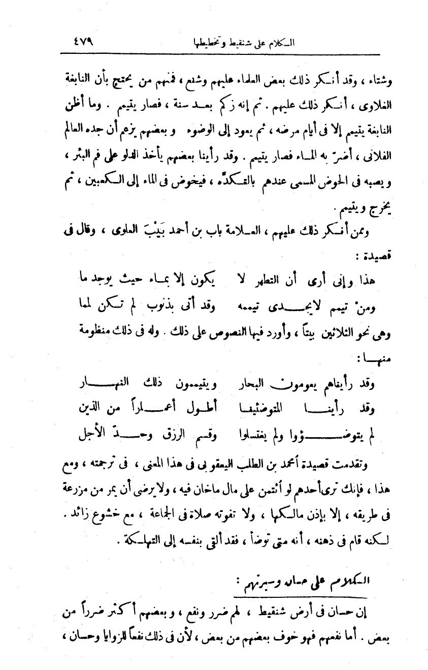 وشتاء، وقد أنكر ذلك بعض العلماء عليهم وشنع، فمنهم من يحتج بأن النابغة الغلاوي، أنكر ذلك عليهم. ثم إنه زكم بعد سنة، فصار يتيمم. وما أظن النابغة يتيمم إلا في أيام مرضه، ثم يعود إلى الوضوء. وبعضهم يزعم أن جده العالم الفلاني، أضرّ به الماء فصار يتيمم. وقد رأينا بعضهم يأخذ الدلو على فم البئر، ويصبه في الحوض المسمى عندهم بالتكدَّه، فيخوض في الماء إلى الكعبين، ثم يخرج ويتيمم.