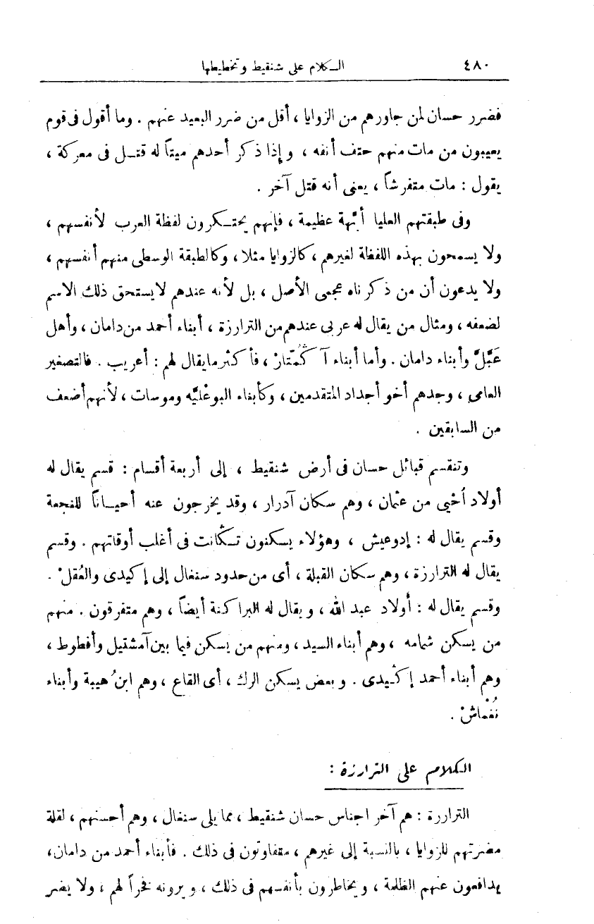 الترارزة: هم آخر أجناس حسان شنقيط، مما يلي سنغال، وهم أحسنهم، لقلة مضرتهم للزوايا، بالنسبة إلى غيرهم، متفاوتون في ذلك. فأبناء أحمد من دامان، يدافعون عنهم الظلمة، ويخاطرون بأنفسهم في ذلك، ويرونه فخرا لهم، ولا يضر