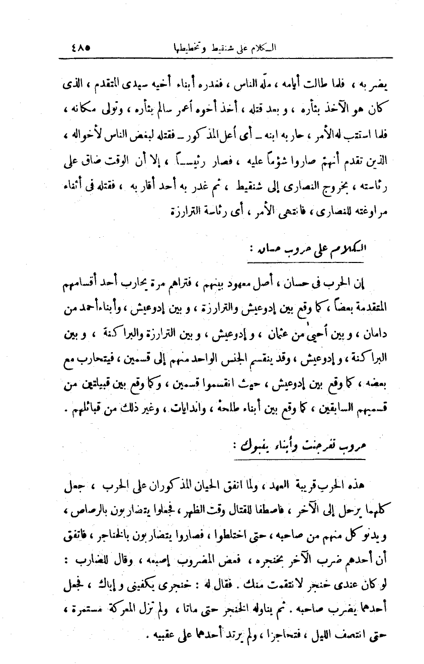 هذه الحروب قريبة العهد، ولما اتفق الحيان المذكوران على الحرب، جعل كلهما يرحل إلى الآخر، فاصطفا للقتال وقت الظهر، فجعلوا يتضاربون بالرصاص، ويدنو كل منهم من صاحبه، حتى اختلطوا، فصاروا يتضاربون بالخناجر، فاتفق أن أحدهم ضرب الآخر بخنجره، فعض المضروب إصبعه، وقال للضارب: لو كان عندي خنجر لانتقمت منك. فقال له: خنجري يكفيني وإياك، فجعل أحدهما يضرب صاحبه. ثم يناوله الخنجر حتى ماتا، ولم تزل المعركة مستمرة، حتى انتصف الليل، فتحاجزا، ولم يرتد أحدهما على عقبيه.