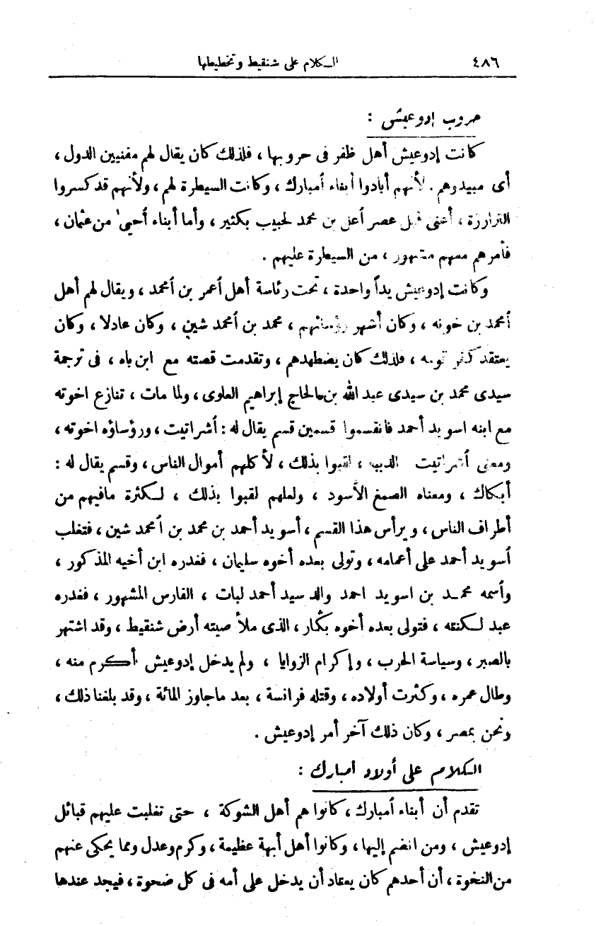 سيدي محمد بن سيدي عبد الله بن الحاج إبراهيم العلوي، ولما مات، تنازع اخوته مع ابنه اسويد أحمد فانقسموا قسمين. قسم يقال له: اشراتيت، ورؤساؤه اخوته، ومعنى اشراتيت: الدببه، لقبوا بذلك، لأكلهم أموال الناس، وقسم يقال له: أبكاك، ومعناه الصمغ الأسود، ولعلهم لقبوا بذلك، لكثرة ما فيهم من أطراف الناس، ويرأس هذا القسم، أسويد أحمد بن محمد بن امحمد شين، فتغلب اسويد أحمد على أعمامه، وتولى بعده أخوه سليمان، فغدره ابن أخيه المذكور، واسمه محمد بن اسويد أحمد والد سيد أحمد لبات، الفارس المشهور، فغدره عبد لكنته، فتولى بعده أخوه بكار، الذي ملأ صيته أرض شنقيط، وقد اشتهر بالصبر، وسياسة الحرب، وإكرام الزوايا، ولم يدخل إدوعيش أكرم منه، وطال عمره، وكثرت أولاده، وقتله فرانسة، بعدما جاوز المائة، وقد بلغنا ذلك، ونحن بمصر، وكان ذلك آخر أمر إدوعيش.