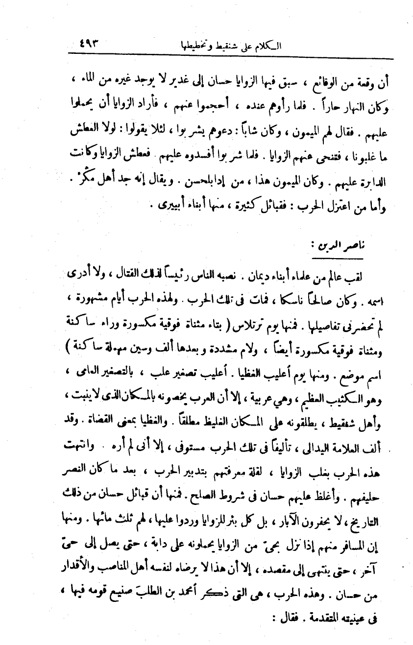ومثناة فوقية مكسورة أيضا، ولام مشددة وبعدها ألف وسين مهمله ساكنة) اسم موضع. ومنها يوم اعليب الغظيا. اعليب تصغير علب، بالتصغير العامي، وهو الكثيب العظيم، وهي عربية، إلا أن العرب يخصونه بالمكان الذي لا ينبت، وأهل شنقيط، يطلقونه على المكان الغليظ مطلقا. والغظيا بمعنى القضاة. وقد ألف العلامة اليدالي، تأليفا في تلك الحرب مستوفى، إلا أني لم أره. وانتهت هذه الحرب بغلب الزوايا، لقلة معرفتهم بتدبير الحرب، بعدما كان النصر حليفهم. وأغلظ عليهم حسان في شروط الصلح. فمنها أن قبائل حسان من ذلك التاريخ، لا يحفرون الآبار، بل كل بئر للزوايا وردوا عليها، لهم ثلث مائها. ومنها إن المسافر منهم إذا نزل بحيّ من الزوايا يحملونه على دابة، حتى يصل إلى حيىّ آخر، حتى ينتهي إلى مقصده، إلا أن هذا لا يرضاه لنفسه أهل المناصب والأقدار من حسان. وهذه الحرب، هي التي ذكر امحمد بن الطلب صنيع قومه فيها، في عينيته المتقدمة. فقال: