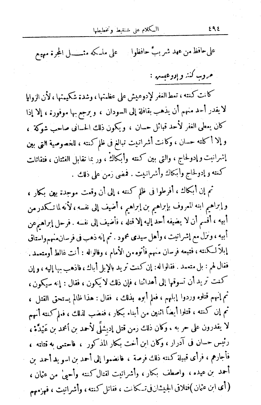 لا يضيفه أحد إليه إلا قتله، فأضيف إلى نفسه. فرحل إبراهيم عن أبيه، ونزل مع إشراتيت، وأهل سيدي محمود. ثم إنه ذهب في فرسان منهم واستاق إبلا لكنته، فتبعه فرسان منهم، فأتوه من الأمام، وقالوا له: أنت غالط أو متعمد. فقال لهم: بل متعمد. فقالوا له: إن كنت تريد بالإبل أباك، فاذهب بها إليه، وإن كنت تريد أن تسوقها إلى أعدائنا، فإن ذلك لا يكون، فقال: إنه سيكون، ثم إنهم قتلوه وردوا إبلهم، فعلم أبوه بذلك، فقال: هذا ظالم يستحق القتل، ثم إن كنته، قتلوا أيضا اثنين من أبناء بكار، فغضب لذلك، فعلم كنته أنهم لا يقدرون على حربه، وكان ذلك زمن قتل إديشلِّي لأحمد بن امحمد بن عَيْدَّهْ، رئيس حسان في آدرار، وكان ابن أخت بكار المذكور، فاحتمى به قتلته، فأجارهم، فرأى قبيلة كنته ذلك فرصة، فانضموا إلى أحمد بن اسويد أحمد بن أحمد بن عيده، واصطف بكار، وأشراتيت لقتال كنته، وأحيى من عثمان، (أي ابن عثمان) فتلاقى الجيشان في تكانت، فقاتل كنته وأشراتيت، فهزمهم