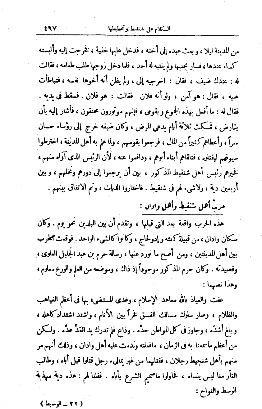 عفت والعياذ بالله معاهد الإسلام، وغدى المستضيئ بها في أعظم الغياهب والظلام، وصار سلوك مسالك الفسق فخرا بين الأنام، واشتد اشتداد كاهله، وبلغ أشده، وجاوز في كل المواطن حدَّه. وذاع فلم تدرك يد العَدَّ عدَّه. ولكن من أعظم ما سمعنا به في الزمان، ما فعلته وندمت عليه أهل وادان، وذلك أنهم مر منهم بأهل شنجيط رجلان، فقتلهما من غير يمالئ رجل قتلوا قبل أباه، وطالب الثأر منا ليس ينساه، فحاولوا ما صميم الشرع يأباه. فقلنا لهم: هذه دية مهذبة الوسط والنواح: