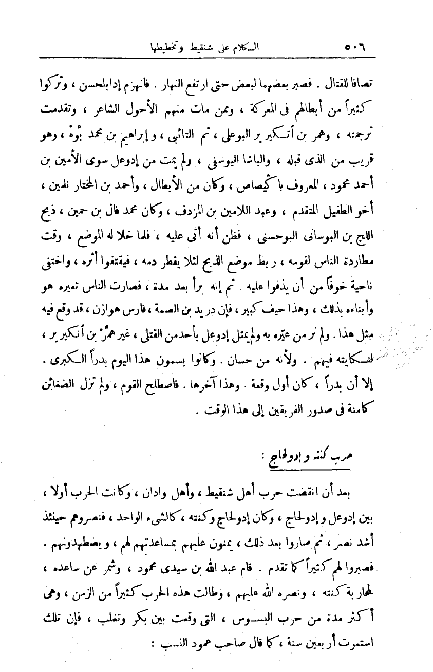 تصافا للقتال. فصبر بعضهما لبعض حتى ارتفع النهار. فانهزم إدابلحسن، وتركوا كثيرا من أبطالهم في المعركة، وممن مات منهم الأحول الشاعر، وتقدمت ترجمته، وهمر بن اتكيرير البوعلي، ثم التائبي، وإبراهيم بن محمد بوَّهْ، وهو قريب من الذي قبله، والباشا اليوسفي، ولم يمت من إدوعل سوى الأمين من أحمد محمود، المعروف باكيصاص، وكان من الأبطال، وأحمد بن المختار نلمين، أخو الطفيل المتقدم، وعبد اللامين بن المزدف، وكان محمد فال بن حمين، ذبح اللج بن البوساني البوحسني، فظن إنه أتى عليه، فلما خلاله الموضع، وقت مطاردة الناس لقومه، ربط موضع الذبح لئلا يقطر دمه، فيقتفوا أثره، واختفى ناحية خوفا من أن يذفوا عليه. ثم إنه برأ بعد مدة، فصارت الناس تعيره هو وأبناءه بذلك، وهذا حيف كبير، فإن دريد بن الصمة، فارس هوزان، قد وقع فيه مثل هذا. ولم نر من عيّره به ولم يمثل إدوعل بأحد من القتلى، غير همَّر بن انكيرير، لنكايته فيهم. ولأنه من حسان. وكانوا يسمون هذا اليوم بدراً الكبرى. إلا أن بدراً، كان أول وقعة. وهذا آخرها. فاصطلح القوم، ولم تزل الضغائن كامنة في صدور الفريقين إلى هذا الوقت.