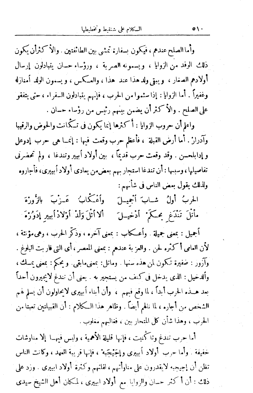 واعلم أن حروب الزوايا: أكثرها إنما يكون في تكانت والحوض والرقيبا وآدرار. أما أرض القبلة، فأعظم حرب وقعت فيها: إنما هي حرب إدوعل وإدابلحسن. وقد وقعت حرب قديما، بين أولاد ابيير وتندغا، ولم تحضرني تفاصيلها، وسببها: أن تندغا استجار بهم بعض من يعادي أولاد ابييري، فأجاروه ولذلك يقول بعض الناس في شأنهم:
