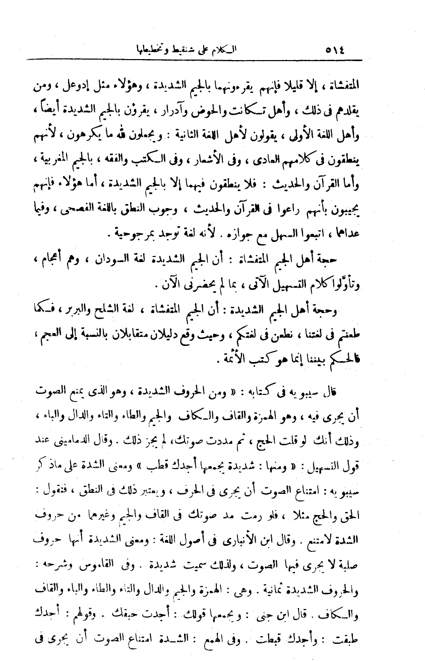وحجة أهل الجيم الشديدة: أن الجيم المتفشاة، لغة الشلح والبربر، فكما طعنتم في لغتنا، نطعن في لغتكم، وحيث وقع دليلان متقابلان بالنسبة إلى العجم، فالحكم بيننا إنما هو كتب الأئمة.