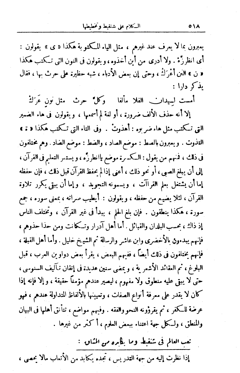 إلا إنه حذف الألف ضرورة، أو لغة لم أسمعها، ويقولون في هاء الضمير التي تكتب مثل هاء ضربوه: أهذونْ. وفي التاء التي تكتب هكذا (ة) التذوت. ويعبرون بالصط: موضع الصاد، والضط: موضع الضاد. وهم مختلفون في ذلك، فمنهم من يقول: الكسرة موضع يا انطرزَّه، ويستمر التعليم في القرآن، إلى أن يبلغ الصبي، أو نحو ذلك، أعني إذا لم يحفظ القرآن قبل ذلك، فإن حفظه إما أن يشتغل بعلم القراآت، ويسمونه التجويد، وإما أن يبقى يكرر تلاوة القرآن، لئلا يضيع من حفظه، ويقولون: أيطيب صراته، بمعنى سوره، جمع سورة، هكذا ينطقون. فإن بلغ الحلم، يبدأ في غير القرآن، وتختلف الناس إذ ذاك، بحسب البلدان والقبائل. أما أهل آدرار وتكانت ومن حذا حذوهم، فإنهم يبدءون بالأخضري وابن عاشر والرسالة ثم الشيخ خليل. وأما أهل القبلة، فإنهم يختلفون في ذلك أيضا، ففيهم البعض، يقرأ بعض دواوين العرب، قبل البلوغ، ثم العقائد الأشعرية، ويمضي سنين عديدة في إتقان تآليف السنوسي، حتى لا يبقى عليه منطوق ولا مفهوم، ليصير عندهم مؤمنا حقيقة، وإلا فإنه إذا كان لا يقدر على معرفة أنواع الصفات، وتعيينها بالألفاظ المتداولة عندهم، فهو عرضة للكفر، ثم يقرؤونه النحو والفقه. وفيهم مواضع، تتأنق أهلها في البيان والمنطق، ولكل جهة اعتناء ببعض العلوم، أكثر من غيرها.