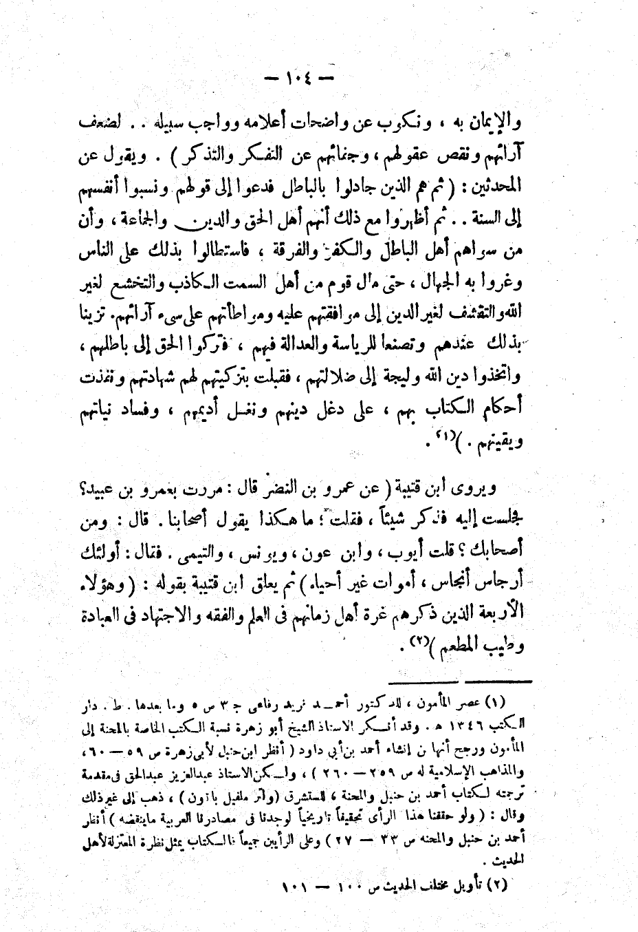(١) " عصر المأمون " للدكتور أحمد فريد رفاعي: ج ٣ ص ٥. ط. دار الكتب ١٣٤٦ هـ. وقد أنكر الأستاذ الشيخ أبو زهرة نسبة الكتب الخاصة بالمحنة إلى المأمون وَرجَّحَ أنها من إنشاء أحمد بن أبي داود (انظر " ابن حنبل " لأبي زهرة: ص ٥٩، ٦٠؛ و" المذاهب الإسلامية " له: ص ٢٥٩، ٢٦٠)، ولكن الأستاذ عبد العزيز عبد الحق في مقدمة ترجمته لكتاب " أحمد بن حنبل والمحنة " للمستشرق (ولتر ملفيل باتون)، ذهب إلى غير ذلك وقال: «وَلَو حَقَّقْنَا هَذَا الرَّأْيَ تَحْقِيقًا تَارِيخِيًّا لَوَجَدْنَا فِي مَصَادِرِنَا العَرَبِيَّةِ مَا يَنْقُضُهُ» انظر " أحمد بن حنبل والمحنة ": ص ٣٣، ٣٧) وعلى الرأيين جميعًا فالكتاب يمثل نظرة المعتزلة لأهل الحديث.
