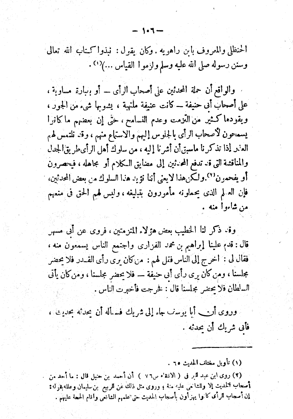 والواقع أَنَّ حَمْلَةَ المُحَدِّثِينَ على أصحاب الرأي - أو بعبارة مساوية، على أصحاب أبي حنيفة - كانت عنيفة ملتهبة، يشوبها شيء من الجور، ويقودها كثير من التزمت وعدم التسامح، حتى إن بعضهم ما كانوا يسمحون لأصحاب الرأي بالجلوس إليهم والاستماع منهم، وقد نلتمس لهم العذر إذا تذكرنا ما سبق أن أشرنا إليه، من سلوك أهل الرأي طريق الجدل والمناقشة التي قد تدفع المحدثين إلى مضايق الكلام أو مجاهله، فيحصرون أو يفحمون (٢). ولكن هذا لا يعني أَنَّنَا نُؤَيِّدُ هَذَا السُّلُوكَ مِنْ بَعْضِ المُحَدِّثِينَ، فإن العلم الذي يحملونه مأمورون بتبليغه، وليس لهم الحق في منعهم من شاءوا منه.