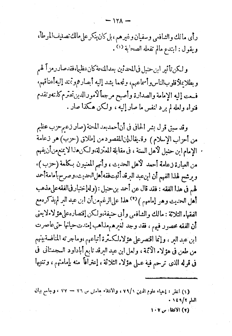 وقد سبق قول بشر الحافي في أن أحمد بعد المحنة وبذلك «صَارَ زَعِيمَ حِزْبٍ عَظِيمٍ مِنْ أَحْزَابِ الإِسْلاَمِ» وقد يقال إن المقصود من إطلاق (حزب) هو زعامة الإمام ابن حنبل لأهل السنة، في مقابلة المعتزلة، ولكن هذا لا يمنع من أن يفهم من العبارة زعامة أحمد لأهل الحديث، وأنهم المعنيون بكلمة (حزب)، ويرشح لهذا الفهم أن ابن عبد البر قد أثبت فقه أهل الحديث، وصرح بإمامة أحمد لهم في هذا الفقه: فقد قال عن أحمد بن حنبل: «وَلَهُ [اخْتِيَارٌ] فِي الْفِقْهِ عَلَى مَذْهَبِ أَهْلِ الْحَدِيثِ وَهُوَ إِمَامُهُمْ» (٢) هذا على الرغم من أن ابن عبد البر لم يذكره مع الفقهاء الثلاثة: مالك والشافعي وأبي حنيفة، ولكن اقتصاره على هؤلاء لا يعني أن الفقه محصور فيهم، فقد وجد لغيرهم مذاهب امتدت حياتها حتى عاصرت ابن عبد البر، وإنما اقتصر على هؤلاء لكثرة أتباعهم، وما جرته المنافسة بينهم من طعن في هؤلاء الأئمة، ولعل ابن عبد البر قد تابع أبا داود السجستاني في قوله الذي ترحم فيه على هؤلاء الثلاثة اعترافًا منه بإمامتهم، وتنبيهًا