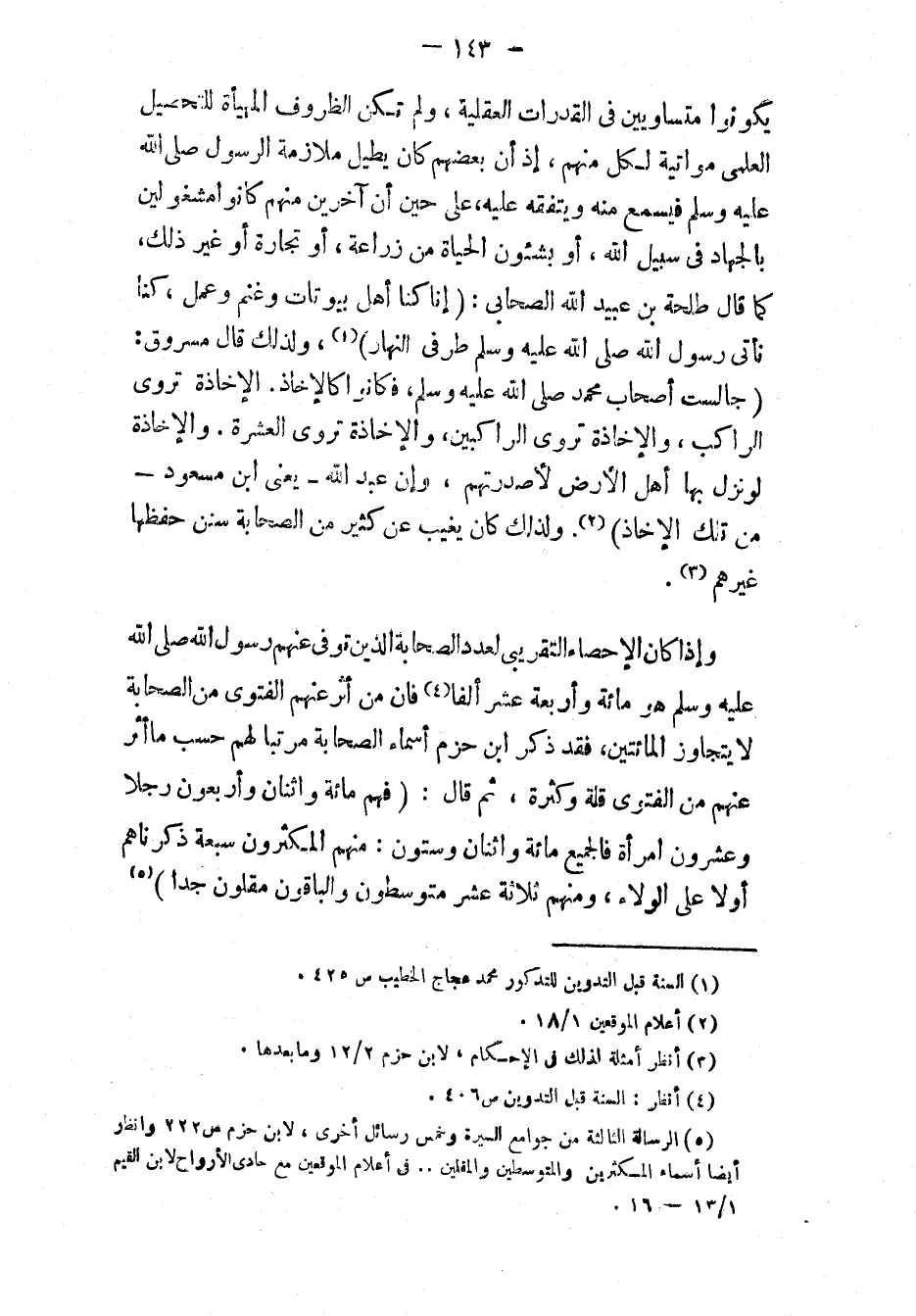 يكونوا متساويين في القدرات العقلية، ولم تكن الظروف المهيأة للتحصيل العلمي مواتية لكل منهم، إذ أن بعضهم كان يطيل ملازمة الرسول - صَلَّى اللهُ عَلَيْهِ وَسَلَّمَ - فيسمع منه ويتفقه عليه، على حين أن آخرين منهم كانوا مشغولين بالجهاد في سبيل الله، أو بشؤون الحياة من زراعة، أو تجارة أو غير ذلك، كما قال طلحة بن عبيد الله الصحابي: «إِنَّا كُنَّا أَهْلَ بُيُوتَاتٍ وَغَنَمٍ وَعَمَلٍ، كُنَّا نَأْتِي رَسُولَ اللهِ - صَلَّى اللهُ عَلَيْهِ وَسَلَّمَ - طَرَفَيْ النَّهَارِ» (١)، ولذلك قال مسروق: «جَالَسْتُ أَصْحَابَ مُحَمَّدٍ - صَلَّى اللهُ عَلَيْهِ وَسَلَّمَ - فَكَانُوا كَالإِخَاذِ: الإِخَاذَةُ تَرْوِي الرَّاكِبَ، وَالإِخَاذَةُ تَرْوِي الرَّاكِبَيْنِ وَالإِخَاذَةُ تَرْوِي العَشَرَةَ، وَالإِخَاذَةُ لَوْ نَزَلَ بِهَا أَهْلُ الأَرْضِ لأَصْدَرْتُهُمْ، وَإِنَّ عَبْدَ اللَّهِ - يعني ابن مسعود - مِنْ تِلْكَ الإِخَاذِ» (٢). ولذلك كان يغيب عن كثير من الصحابة سنن حفظها غيرهم (٣).