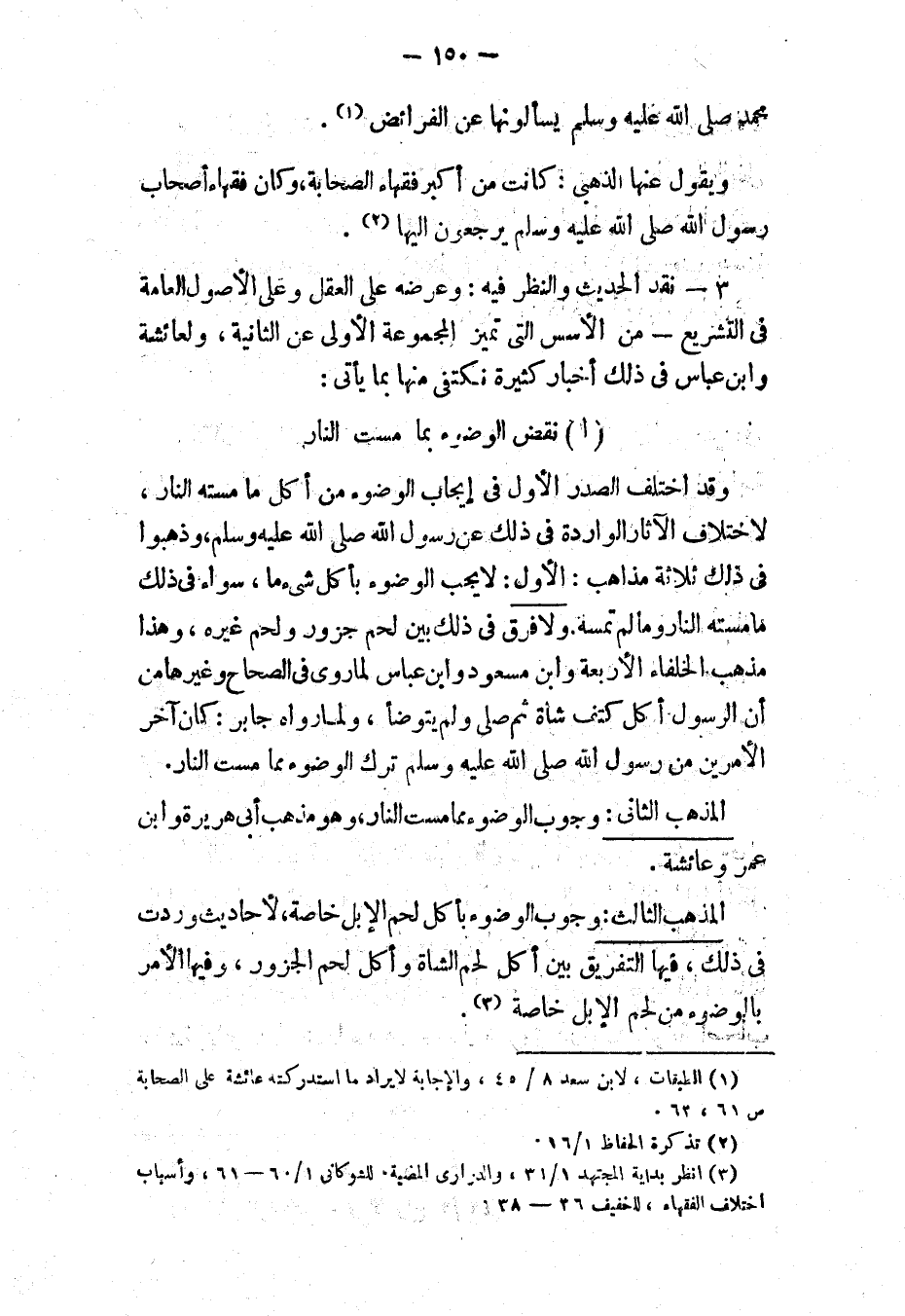 - المذهب الثالث: وجوب الوضوء بأكل لحم الإبل خاصة، لأحاديث وردت في ذلك، فيها التفريق بين أكل لحم الشاة وأكل لحم الجزور، وفيها الأمر بالوضوء من لحم الإبل خاصة (٣).