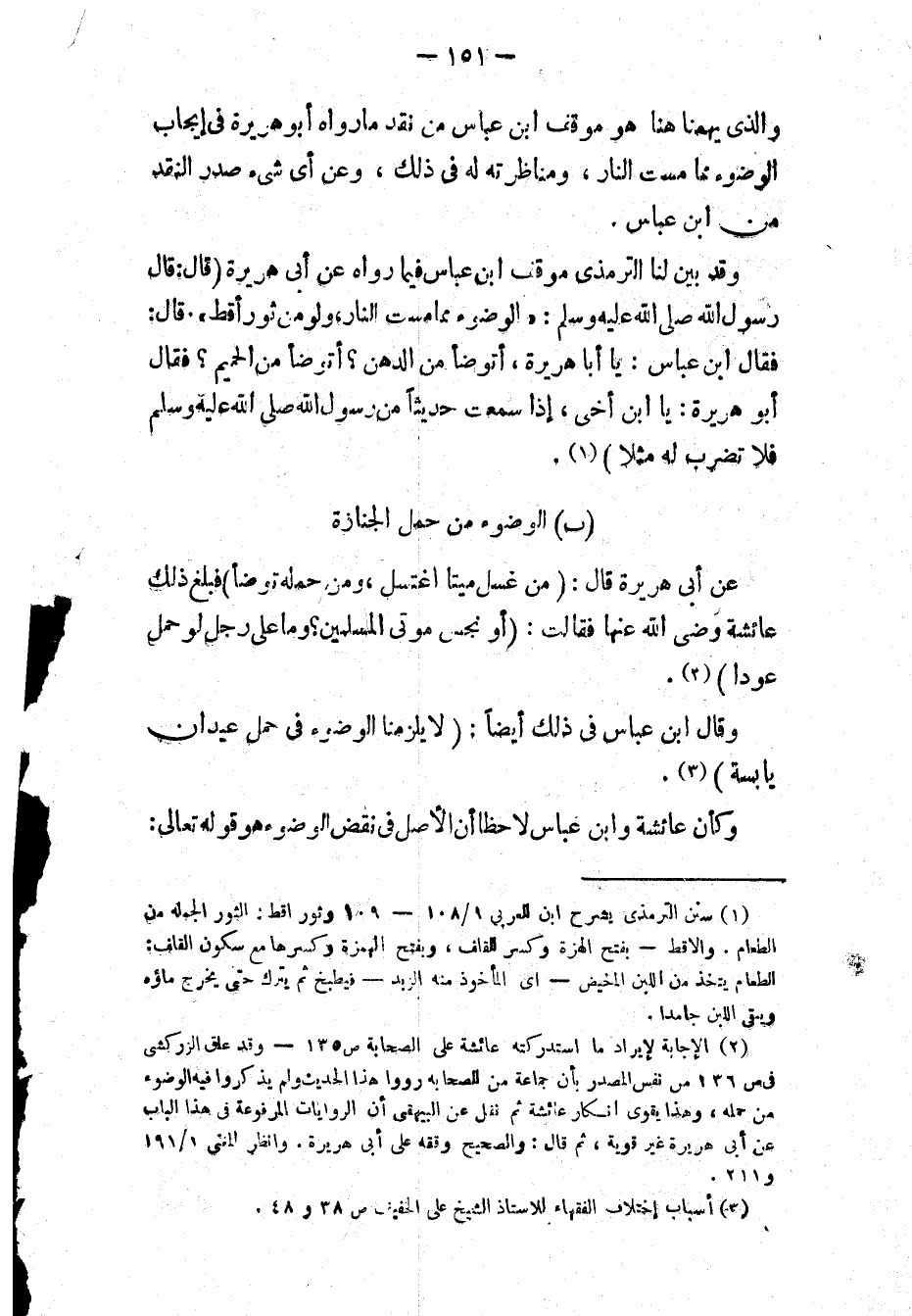 وقد بين لنا الترمذي موقف ابن عباس فيما رواه عَنْ أَبِي هُرَيْرَةَ، قَالَ: قَالَ رَسُولُ اللَّهِ - صَلَّى اللَّهُ عَلَيْهِ وَسَلَّمَ -: «الوُضُوءُ مِمَّا مَسَّتِ النَّارُ، وَلَوْ مِنْ ثَوْرِ أَقِطٍ»، قَالَ: فَقَالَ لَهُ ابْنُ عَبَّاسٍ: «يَا أَبَا هُرَيْرَةَ، أَنَتَوَضَّأُ مِنَ الدُّهْنِ؟ أَنَتَوَضَّأُ مِنَ الحَمِيمِ؟»، قَالَ: فَقَالَ أَبُو هُرَيْرَةَ: «يَا ابْنَ أَخِي، إِذَا سَمِعْتَ حَدِيثًا عَنْ رَسُولِ اللَّهِ - صَلَّى اللَّهُ عَلَيْهِ وَسَلَّمَ - فَلاَ تَضْرِبْ لَهُ مَثَلاً» (١).