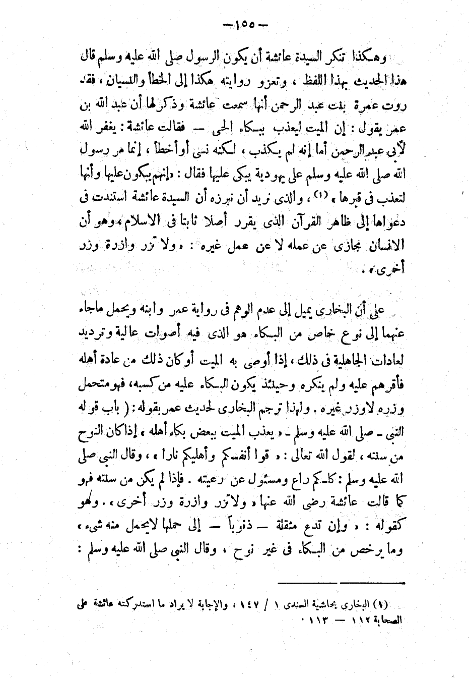 وهكذا تنكر السيدة عائشة أن يكون الرسول - صَلَّى اللهُ عَلَيْهِ وَسَلَّمَ - قال هذا الحديث بهذا اللفظ، وتعزو روايته هكذا إلى الخطأ والنسيان، فقد روت عَمْرَةُ بِنْتِ عَبْدِ الرَّحْمَنِ، أَنَّهَا سَمِعَتْ عَائِشَةَ، وَذُكِرَ لَهَا أَنَّ عَبْدَ اللهِ بْنَ عُمَرَ، يَقُولُ: إِنَّ المَيِّتَ لَيُعَذَّبُ بِبُكَاءِ الْحَيِّ، فَقَالَتْ عَائِشَةُ: يَغْفِرُ اللهُ لِأَبِي عَبْدِ الرَّحْمَنِ أَمَا إِنَّهُ لَمْ يَكْذِبْ، وَلَكِنَّهُ نَسِيَ أَوْ أَخْطَأَ، إِنَّمَا مَرَّ رَسُولُ اللهِ - صَلَّى اللهُ عَلَيْهِ وَسَلَّمَ - عَلَى يَهُودِيَّةٍ يُبْكَى عَلَيْهَا، فَقَالَ: «إِنَّهُمْ لَيَبْكُونَ عَلَيْهَا، وَإِنَّهَا لَتُعَذَّبُ فِي قَبْرِهَا» (١) (*)، والذي نريد أن نبرزه أن السيدة عائشة استندت في دعواها إلى ظاهر القرآن الذي يقرر أصلاً ثابتًا في الإسلام، وهو أن الإنسان مجازى عن عمله لا عن عمل غيره: {وَلاَ تَزِرُ وَازِرَةٌ وِزْرَ أُخْرَى} [الأنعام: ١٦٤].