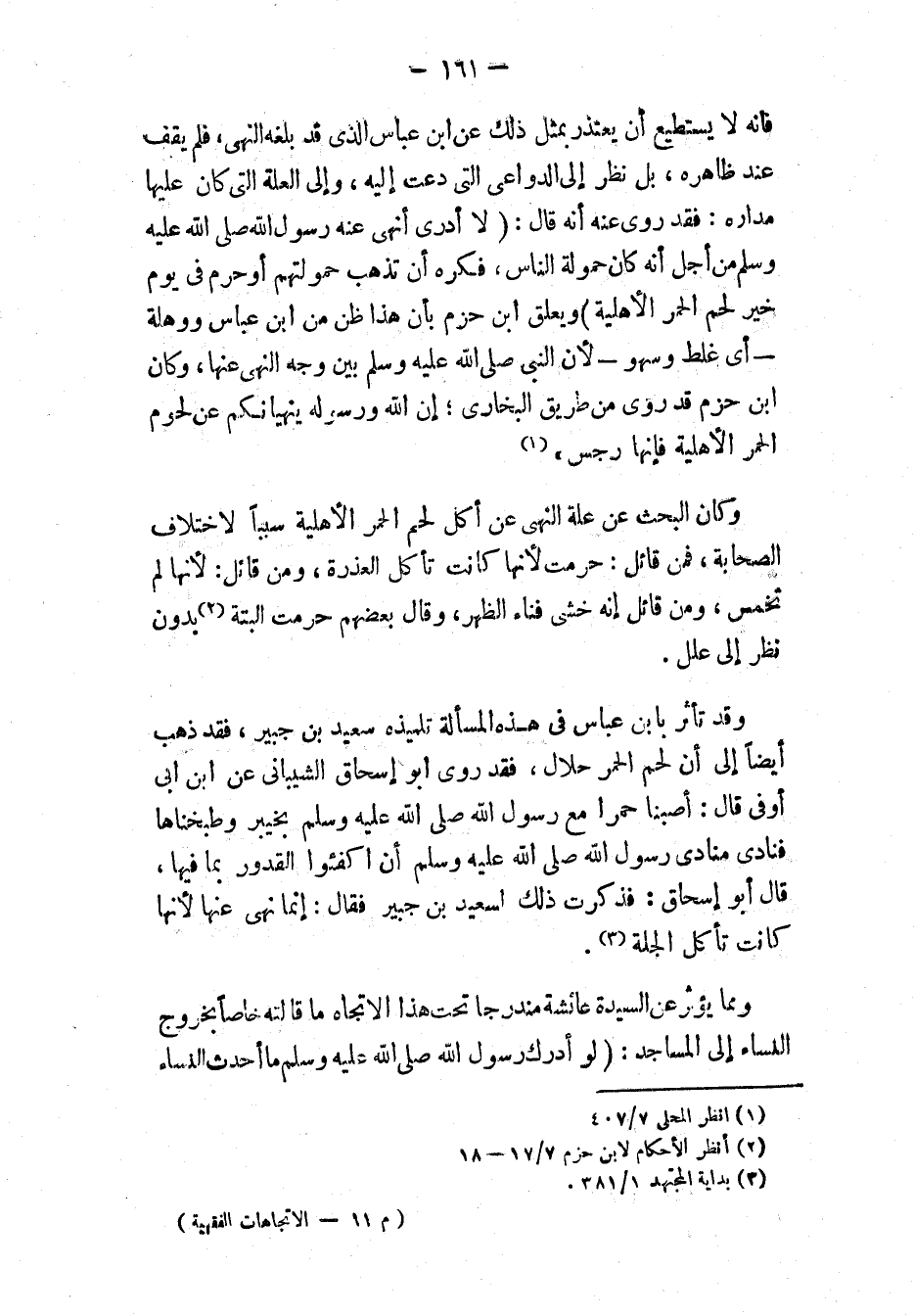 فإنه لا يستطيع أن يعتذر بمثل ذلك عن ابن عباس الذي قد بلغه النهي، فلم يقف عند ظاهره، بل نظر إلى الدواعي التي دعت إليه، وإلى العلة التي كانت عليها مداره: فقد روي عنه أنه قال: «لَا أَدْرِي أَنَهَى عَنْهُ رَسُولُ اللَّهِ - صَلَّى اللَّهُ عَلَيْهِ وَسَلَّمَ - مِنْ أَجْلِ أَنَّهُ كَانَ حَمُولَةَ النَّاسِ، فَكَرِهَ أَنْ تَذْهَبَ حَمُولَتُهُمْ، أَوْ [حَرَّمَهُ] فِي يَوْمِ خَيْبَرَ لَحْمَ الحُمُرِ الأَهْلِيَّةِ» ويعلق ابن حزم بأن هذا ظن من ابن عباس ووهلة - أي غلط وسهو - لأن النبي - صَلَّى اللهُ عَلَيْهِ وَسَلَّمَ - بَيَّنَ وجه النهي عنها، وكان ابن حزم قد روى من طريق " البخاري "، «إِنَّ اللَّهَ وَرَسُولَهُ يَنْهَيَانِكُمْ عَنْ لُحُومِ الحُمُرِ الأَهْلِيَّةِ، فَإِنَّهَا رِجْسٌ» (١).