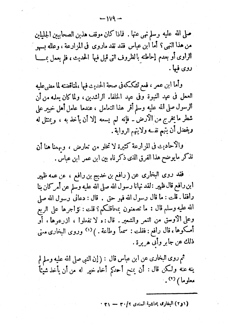 وأما ابن عمر، فمع تشككه في صحة الحديث فيها، لمناقضته لما مضى عليه العمل في عهد النبوة وفي عهد الخلفاء الراشدين، ولما كان يعلمه من أن الرسول - صَلَّى اللهُ عَلَيْهِ وَسَلَّمَ - أقر هذا التعامل، عندما عامل أهل خيبر على شطر ما يخرج من الأرض - فإنه لم يسعه إلا أن يأخذ به، ويمتثل له ويفضل أن يتهم نفسه ولا يتهم الرواية.