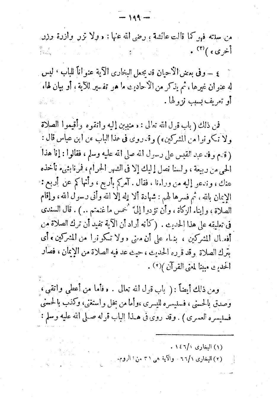 فمن ذلك (بَابُ قَوْلِ اللَّهِ تَعَالَى: {مُنِيبِينَ إِلَيْهِ وَاتَّقُوهُ وَأَقِيمُوا الصَّلاَةَ وَلاَ تَكُونُوا مِنَ المُشْرِكِينَ} [الروم: ٣١]). وقد روى في هذا الباب: حَدَّثَنَا عَنِ ابْنِ عَبَّاسٍ، قَالَ: قَدِمَ وَفْدُ عَبْدِ القَيْسِ عَلَى رَسُولِ اللَّهِ - صَلَّى اللهُ عَلَيْهِ وَسَلَّمَ -، فَقَالُوا: إِنَّا [مِنْ] هَذَا الحَيِّ مِنْ رَبِيعَةَ وَلَسْنَا نَصِلُ إِلَيْكَ إِلاَّ فِي الشَّهْرِ الحَرَامِ، فَمُرْنَا بِشَيْءٍ نَأْخُذْهُ عَنْكَ وَنَدْعُو إِلَيْهِ مَنْ وَرَاءَنَا، فَقَالَ: «آمُرُكُمْ بِأَرْبَعٍ، وَأَنْهَاكُمْ عَنْ أَرْبَعٍ: الإِيمَانِ بِاللَّهِ، ثُمَّ فَسَّرَهَا لَهُمْ: شَهَادَةُ أَنْ لاَ إِلَهَ إِلاَّ اللَّهُ وَأَنِّي رَسُولُ اللَّهِ، وَإِقَامُ الصَّلاَةِ، وَإِيتَاءُ الزَّكَاةِ، وَأَنْ تُؤَدُّوا إِلَيَّ خُمُسَ مَا غَنِمْتُمْ ...»). قال السندي في تعليقه على هذا الحديث: «كَأَنَّهُ أَرَادَ أَنَّ هَذِهِ الآيَةَ تُفِيدُ أَنَّ تَرْكَ الصَّلاَةِ مِنْ أَفْعَالِ المُشْرِكِيْنَ، بِنَاءً عَلَىَ أَنَّ مَعْنَى: {وَلَا تَكُونُوا مِنَ الْمُشْرِكِينَ}، أَيْ بِتَرْكِ الصَّلاَةِ وَقَدْ قَرَّرَهُ الحَدِيثُ، حَيْثُ عَدَّ فِيهِ الصَّلاَةَ مِنَ الإِيمَانِ، فَصَارَ الحَدِيْثُ مُبَيِّنًا لِمَعْنَى القُرْآنِ» (٢).