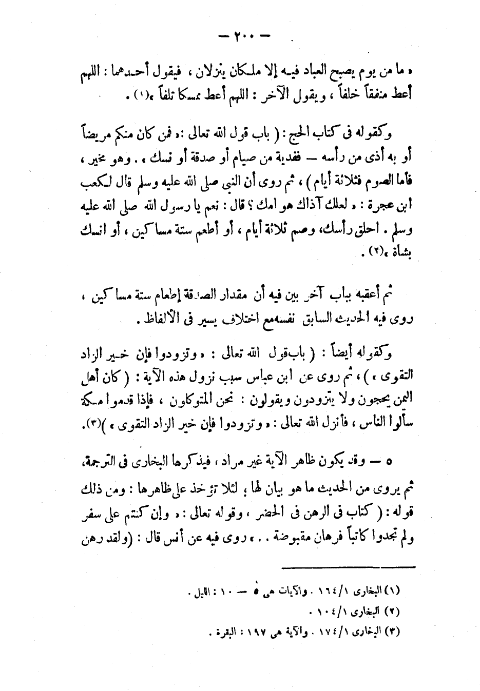 وكقوله في كتاب الحج (بَابُ قَوْلِ اللَّهِ تَعَالَى: {فَمَنْ كَانَ مِنْكُمْ مَرِيضًا أَوْ بِهِ أَذًى مِنْ رَأْسِهِ فَفِدْيَةٌ مِنْ صِيَامٍ أَوْ صَدَقَةٍ أَوْ نُسُكٍ} [البقرة: ١٩٦]، وَهُوَ مُخَيَّرٌ، فَأَمَّا الصَّوْمُ فَثَلاَثَةُ أَيَّامٍ) ثُمَّ رَوَى أَنَّ النَّبِيَّ - صَلَّى اللهُ عَلَيْهِ وَسَلَّمَ - قَالَ لِكَعْبِ بْنِ عُجْرَةَ - رَضِيَ اللهُ عَنْهُ -: «لَعَلَّكَ آذَاكَ هَوَامُّكَ؟»، قَالَ: نَعَمْ يَا رَسُولَ اللَّهِ، فَقَالَ رَسُولُ اللَّهِ - صَلَّى اللهُ عَلَيْهِ وَسَلَّمَ -: «احْلِقْ رَأْسَكَ، وَصُمْ ثَلاَثَةَ أَيَّامٍ، أَوْ أَطْعِمْ سِتَّةَ مَسَاكِينَ، أَوْ انْسُكْ بِشَاةٍ» (٢).