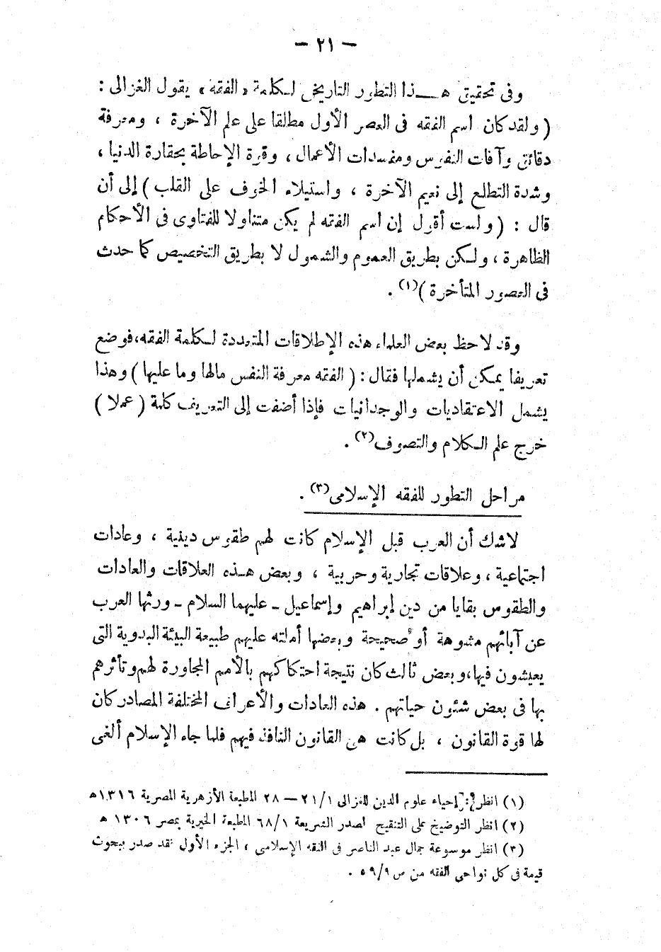 وفي تحقيق هذا التطور التاريخي لكلمة «الفِقْهِ» يقول الغزالي: «وَلَقَدْ كَانَ اسْمُ الفِقْهِ فِي العَصْرِ الأَوَّلِ مُطْلَقًا عَلَى عِلْمِ الآخِرَةِ، وَمَعْرِفَةِ دَقَائِقِ وَآفَاتِ النُّفُوسِ وَمُفْسِدَاتِ الأَعْمَالِ، وَقُوَّةِ الإِحَاطَةِ بِحَقَارَةِ الدُّنْيَا، وَشِدَّةِ التَّطَلُّعِ إِلَى نَعِيمِ الآخِرَةِ، وَاسْتِيلَاءِ الخَوْفِ عَلَى القَلْبِ» إلى أن قال: «وَلَسْتُ أَقُولُ إِنَّ اسْمَ الفِقْهِ لَمْ يَكُنْ مَتْنًا وَلَا لِلْفَتَاوَى فِي الأَحْكَامِ الظَّاهِرَةِ، وَلَكِنْ بِطَرِيقِ العُمُومِ وَالشَّمُولِ لَا بِطَرِيقِ التَّخْصِيصِ كَمَا حَدَثَ فِي العُصُورِ المُتَأَخِّرَةِ» (١).