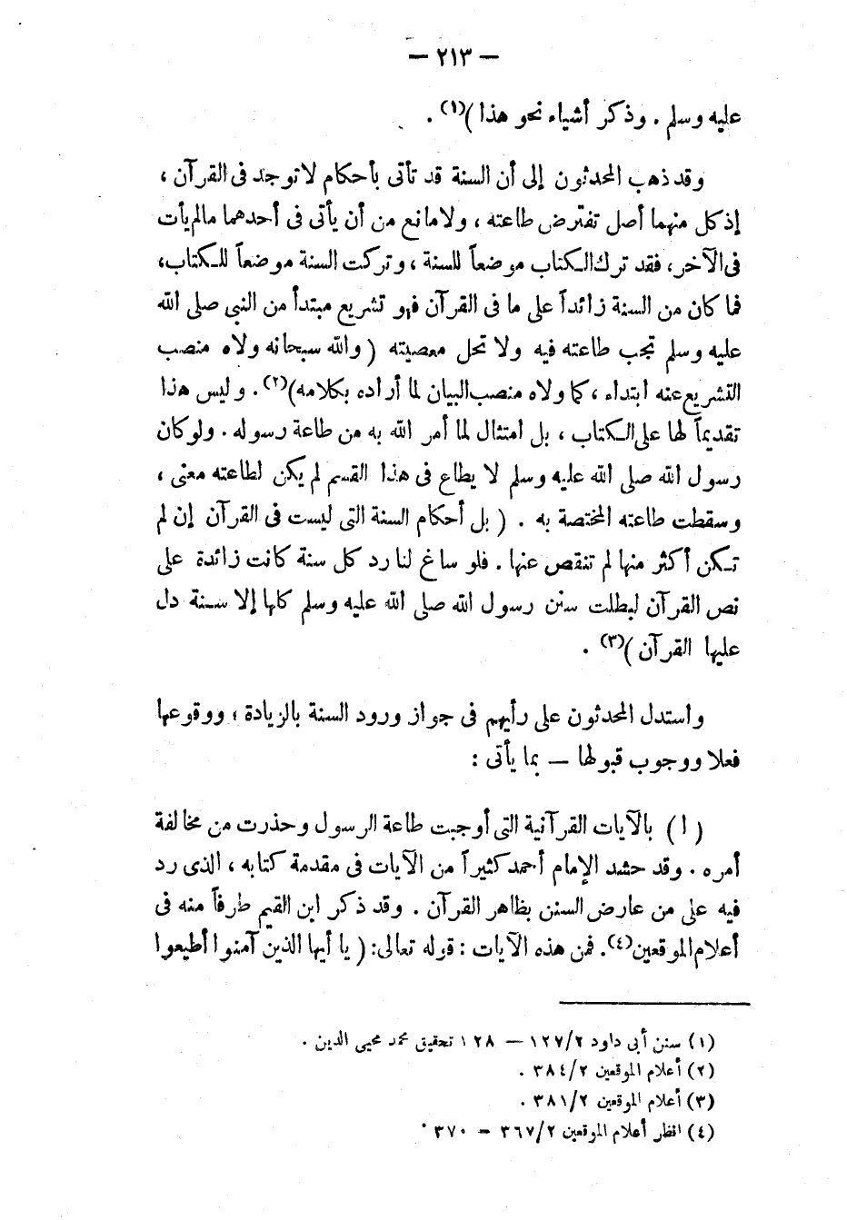 [أ] بالآيات القرآنية التي أوجبت طاعة الرسول وحذرت من مخالفة أمره. وقد حشد الإمام أحمد كثيرًا من الآيات في مقدمة كتابه، الذي رد فيه على من عارض السنن بظاهر القرآن. وقد ذكر ابن القيم طرفًا منه في " إعلام الموقعين " (٤). فمن هذه الآيات قوله تعالى: {يَا أَيُّهَا الَّذِينَ آمَنُوا أَطِيعُوا