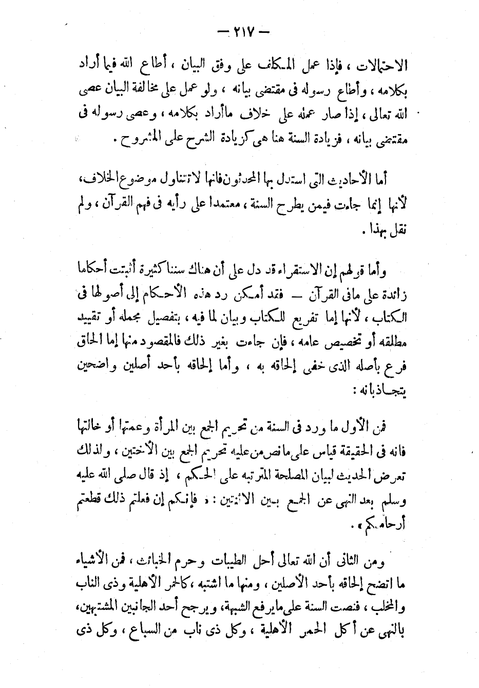 وأما قولهم إن الاستقراء قد دل على أن هناك سُنَنًا كثيرة أثبتت أحكامًا زائدة على ما في القرآن - فقد أمكن رد هذه الأحكام إلى أصولها في الكتاب، لأنها إما تفريع للكتاب وبيان لما فيه، بتفصيل مجمله أو تقييد مطلقه أو تخصيص عامه، فإن جاءت بغير ذلك فالمقصود منها إما إلحاق فرع بأصله الذي خفي إلحاقه به، وإما إلحاقه بأحد أصلين واضحين يتجاذبانه: