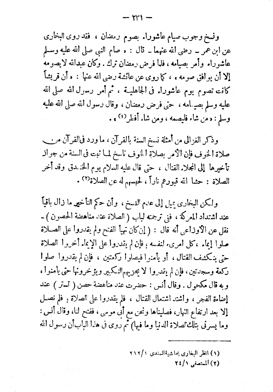 وذكر الغزالي من أمثلة نسخ السنة بالقرآن، ما ورد في القرآن من صلاة الخوف فإن الأمر بصلاة الخوف ناسخ لما ثبت في السنة من جواز تأخيرها إلى انجلاء القتال، حَتَّى قَالَ - عَلَيْهِ السَّلاَمُ - يَوْمَ الخَنْدَقِ وَقَدْ أَخَّرَ الصَّلاَةَ: «حَشَا اللَّهُ قُبُورَهُمْ نَارًا» لِحَبْسِهِمْ لَهُ عَنْ الصَّلاَةِ (٢).