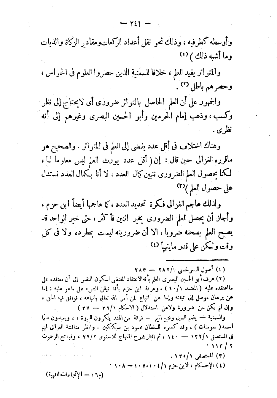 وهناك اختلاف في أقل عدد يفضي إلى العلم في المتواتر. والصحيح هو ما قرره الغزالي حين قال: «أَقَلُّ عَدَدٍ يُورِثُ العِلْمَ لَيْسَ مَعْلُومًا لَنَا، لَكِنَّا بِحُصُولِ العِلْمِ الضَّرُورِيِّ نَتَبَيَّنُ كَمَالَ العَدَدِ لَا أَنَّا بِكَمَالِ العَدَدِ نَسْتَدِلُّ عَلَى حُصُولِ العِلْمِ» (٣).