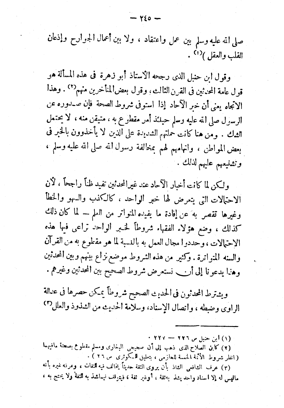 وقول ابن حنبل الذي رجحه الأستاذ أبو زهرة في هذه المسألة هو قول عامة المحدثين في القرن الثالث، وقول بعض المتأخرين منهم (٢). وهذا الاتجاه يعني أن خبر الآحاد إذا استوفى شروط الصحة فإن صدوره عن الرسول - صَلَّى اللهُ عَلَيْهِ وَسَلَّمَ - حينئذٍ أمر مقطوع به، متيقن منه، لا يحتمل الشك. ومن هنا كانت حملتهم الشديدة على الذين لا يأخذون بالخبر في بعض المواطن، واتهامهم لهم بمخالفة رسول الله - صَلَّى اللهُ عَلَيْهِ وَسَلَّمَ -، وتشنيعهم عليهم لذلك.