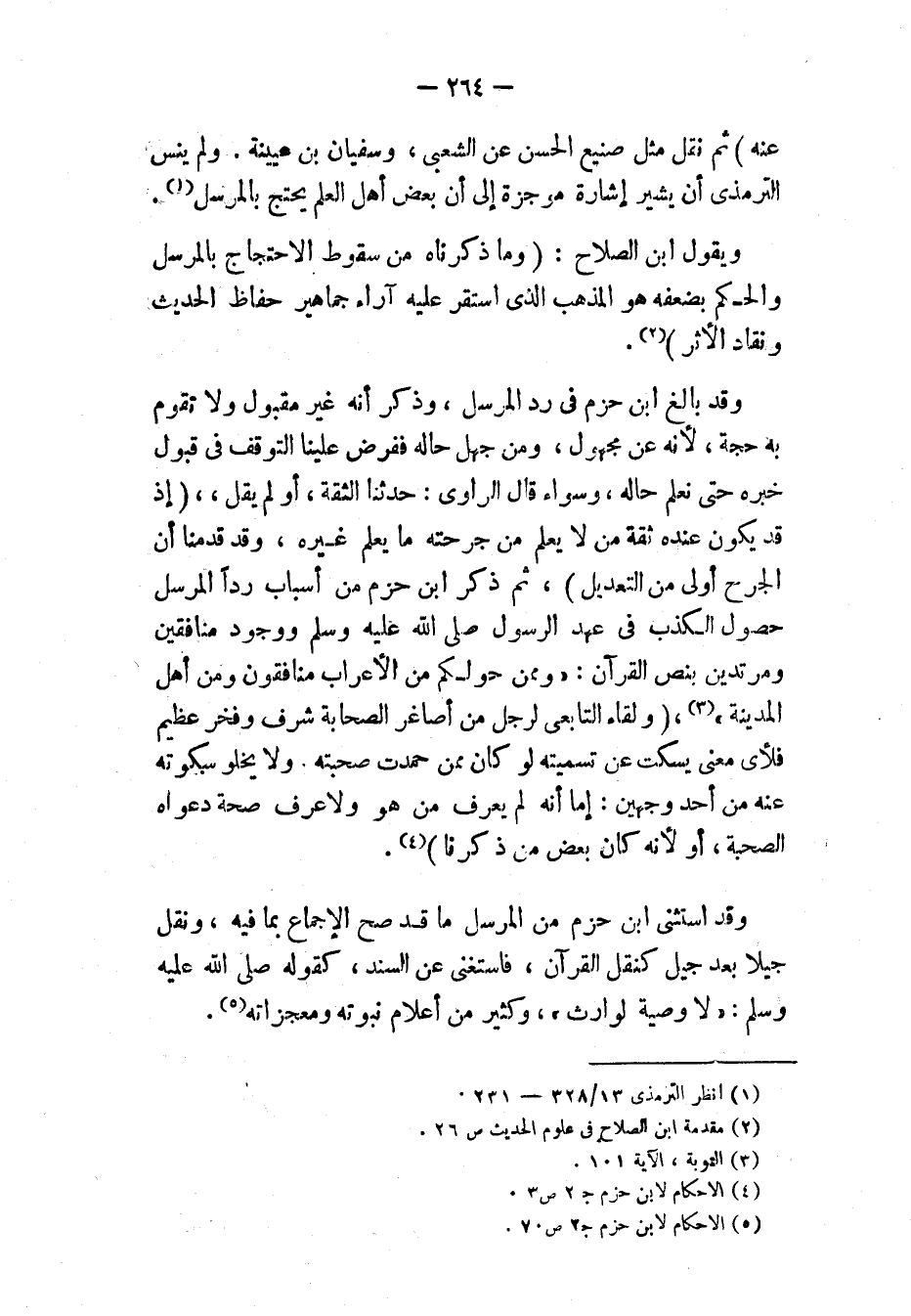 ويقول ابن الصلاح: «وَمَا ذَكَرْنَاهُ مِنْ سُقُوطِ الاحْتِجَاجِ بِالمُرْسَلِ وَالحُكْمِ بِضَعْفِهِ هُوَ المَذْهَبُ الذِي اسْتَقَرَّ عَلَيْهِ آرَاءُ جَمَاهِيرِ حُفَّاظِ الحَدِيثِ وَنُقَّادِ الأَثَرِ» (٢).