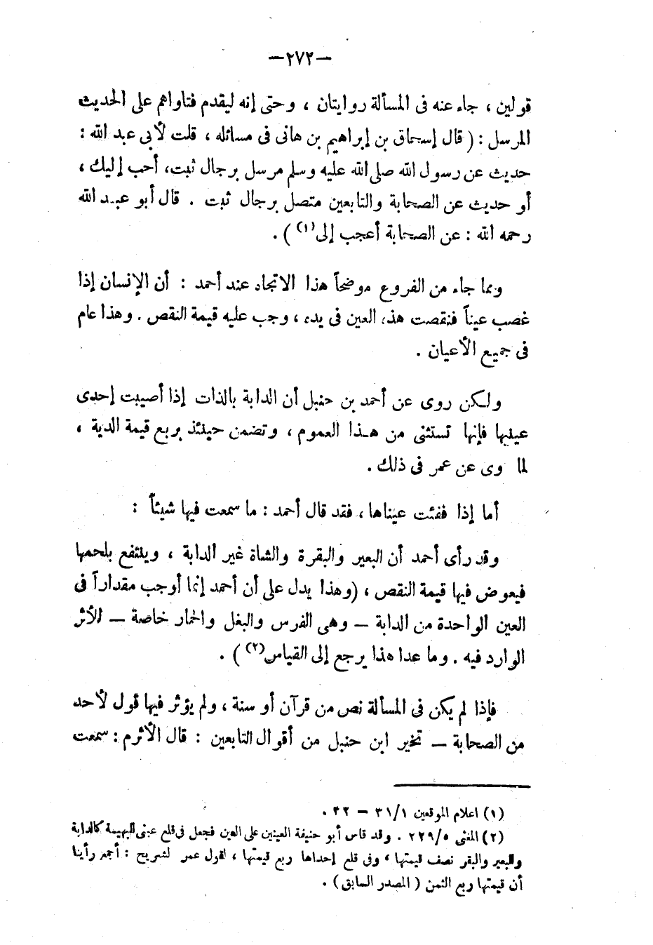 وقد «رَأَى أَحْمَدُ أَنَّ البَعِيرَ وَالبَقَرَةَ وَالشَّاةَ غَيْرَ الدَّابَةِ، وَيُنْتَفَعُ بِلَحْمِهَا فَيُعَوَّضُ فِيهَا قِيمَةُ النَّقْصِ»، «وَهَذَا يَدُلُّ عَلَى أَنَّ أَحْمَدَ إنَّمَا أَوْجَبَ مِقْدَارًا فِي العَيْنِ الْوَاحِدَةِ مِنْ الدَّابَّةِ، وَهِيَ الفَرَسُ وَالبَغْلُ وَالحِمَارُ خَاصَّةً لِلأَثَرِ الوَارِدِ فِيهِ، وَمَا عَدَا هَذَا يُرْجَعُ إلَى القِيَاسِ» (٢).