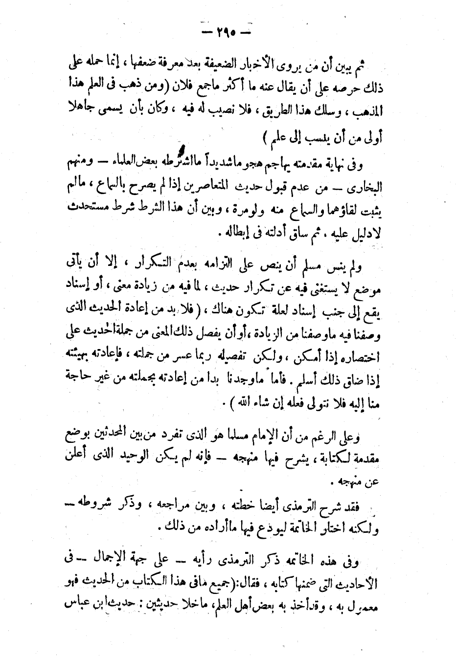 وفي نهاية مقدمته يهاجم هجومًا شديدًا ما اشترطه بعض العلماء - ومنهم البخاري - من عدم قبول حديث المتعاصرين إذا لم يصرح بالسماع، ما لم يثبت لقاؤهما والسماع منه ولو مرة، وبين أن هذا الشرط شرط مستحدث لا دليل عليه، ثم ساق أدلته في إبطاله.