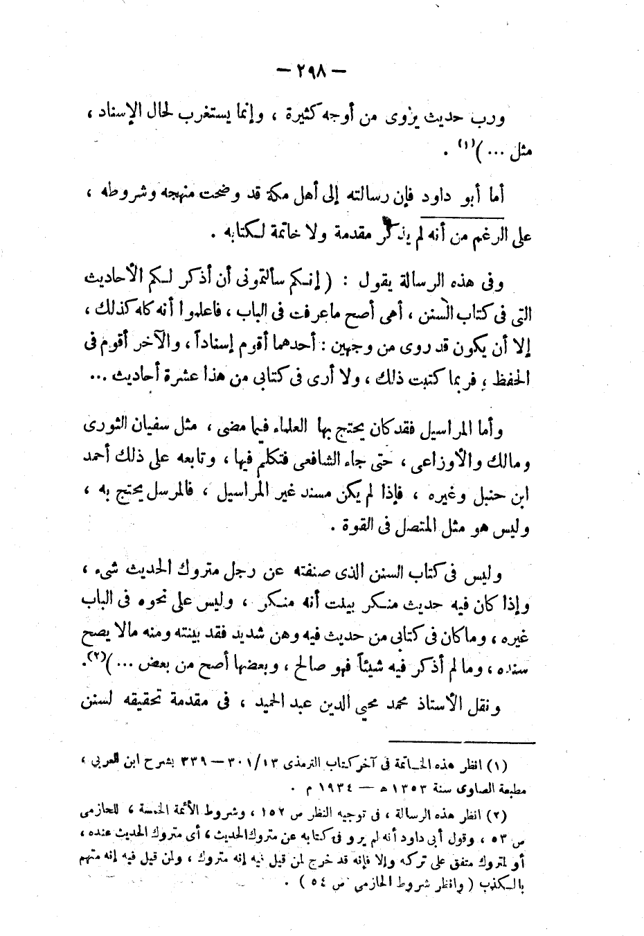 (٢) انظر هذه الرسالة، في " توجيه النظر ": ص ١٥٢؛ و" شروط الأئمة الخمسة " للحازمي: ص ٥٣، وقول أبي داود أنه لم يرو في كتابه عن متروك الحديث، أي متروك الحديث عنده، أو لمتروك متفق على تركه وإلا فإنه قد خَرَّجَ لمن قيل فيه: إنه متروك، ولمن قيل فيه: إنه متهم بالكذب (وانظر " شروط " الحازمي: ص ٥٤).