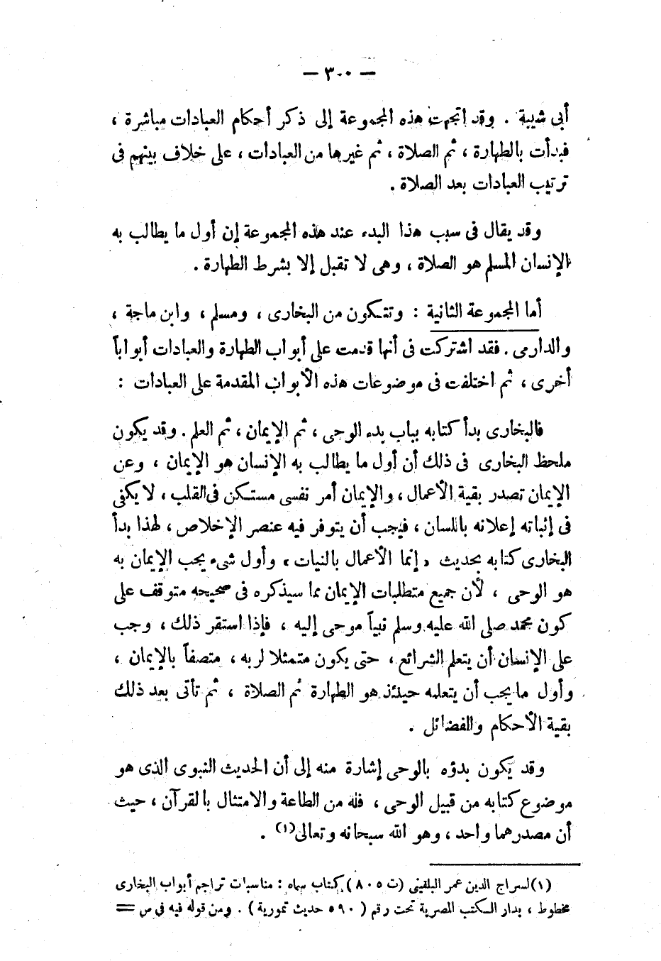 أما المجموعة الثانية: وتتكون من البخاري، ومسلم، وابن ماجه، والدارمي. فقد اشتركت في أنها قدمت على أبواب الطهارة والعبادات أبوابًا أخرى، ثم اختلفت في موضوعات هذه الأبواب المقدمة على العبادات: