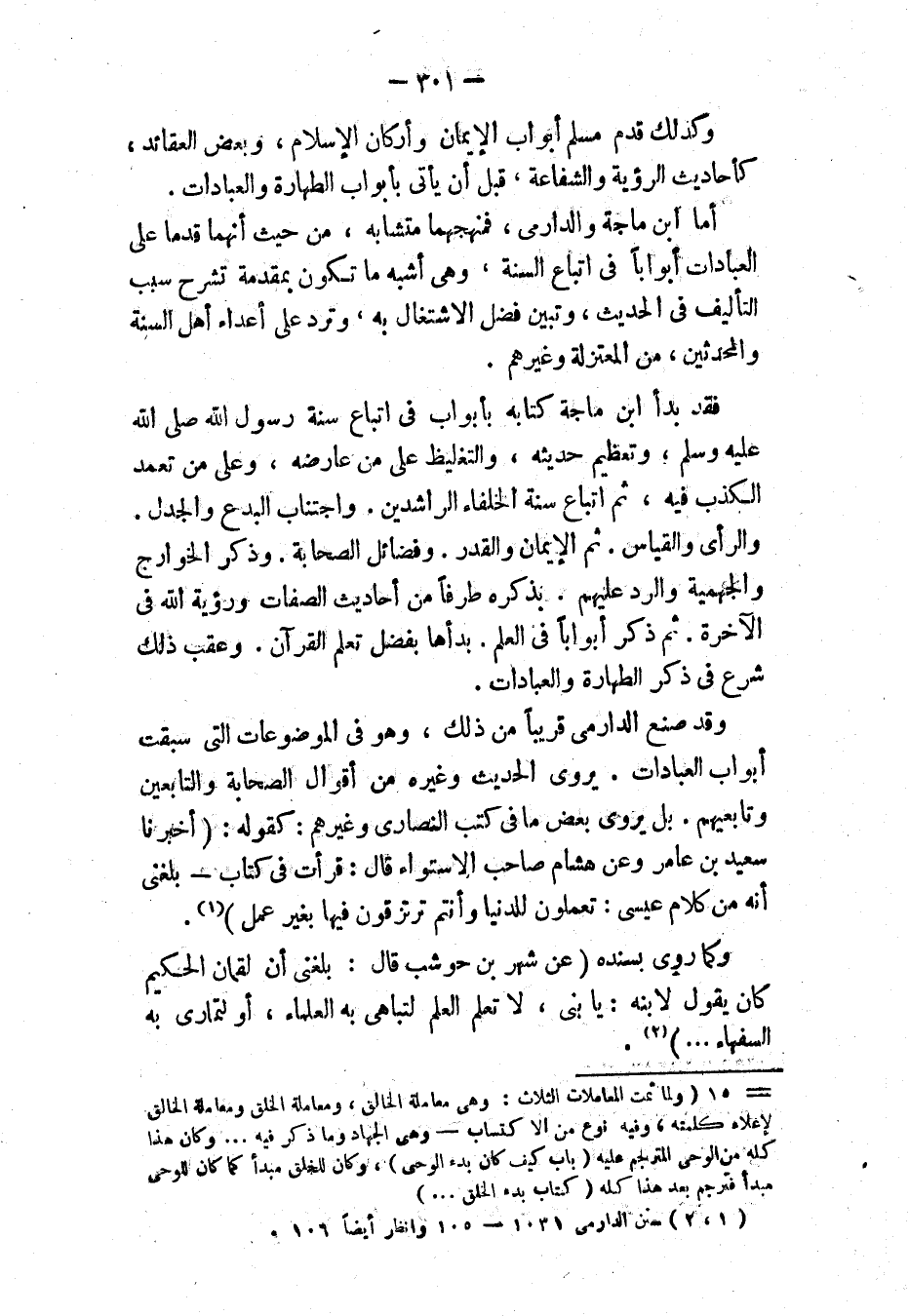 أما ابن ماجه والدارمي، فمنهجهما متشابه، من حيث أنهما قدما على العبادات أبوابًا في اتباع السنة، وهي أشبه ما تكون بمقدمة تشرح سبب التأليف في الحديث، وتبين فضل الاشتغال به، وترد على أعداء أهل السنة والمحدثين، من المعتزلة وغيرهم.