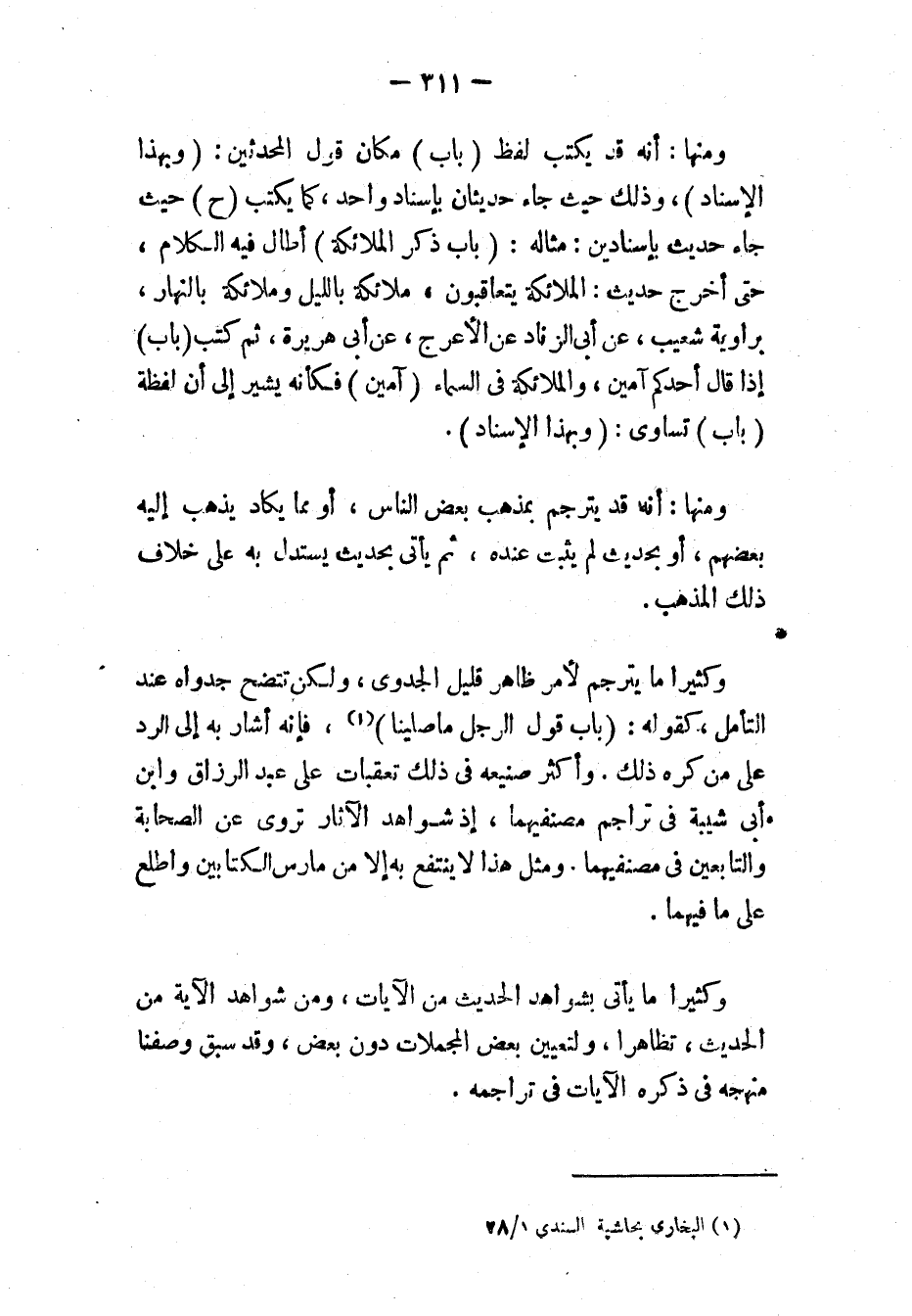 ومنها أنه قد يكتب لفظ (باب) مكان قول المحدثين (وَبِهَذَا الإِسْنَادِ)، وذلك حيث جاء حديثان بإسناد واحد، كما يكتب (ح) حيث جاء حديث بإسناين: مثاله: (بَابُ ذِكْرِ المَلاَئِكَةِ) أطال فيه الكلام، حتى أخرج حديث «المَلاَئِكَةُ يَتَعَاقَبُونَ، مَلاَئِكَةٌ بِاللَّيْلِ، وَمَلاَئِكَةٌ بِالنَّهَارِ»، بِرِوَايَةِ شُعَيْبٍ، عَنْ أَبِي الزِّنَادِ، عَنِ الأَعْرَجِ، عَنْ أَبِي هُرَيْرَةَ - رَضِيَ اللَّهُ عَنْهُ -. ثم كتب (بَابُ إِذَا قَالَ أَحَدُكُمْ: آمِينَ وَالمَلاَئِكَةُ فِي السَّمَاءِ، آمِينَ ...)، فكأنه يشير إلى أن لفظة (باب) تساوي: (وبهذا الإسناد).