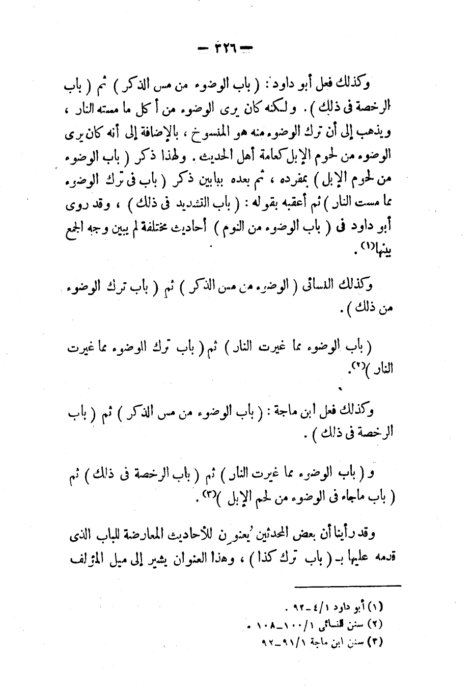 وكذلك فعل أبو داود: (بَابُ الوُضُوءِ مِنْ مَسِّ الذَّكَرِ) ثم (بَابُ الرُّخْصَةِ فِي ذَلِكَ). ولكنه كان يرى الوضوء من أكل ما مسته النار، ويذهب إلى أن ترك الوضوء منه هو المنسوخ، بالإضافة إلى أنه كان يرى الوضوء من لحوم الإبل كعامة أهل الحديث. ولهذا ذكر (بَابُ الوُضُوءِ مِنْ لُحُومِ الإِبِلِ) بمفرده، ثم بعده ببابين ذكر (بَابٌ فِي تَرْكِ الوُضُوءِ مِمَّا مَسَّتِ النَّارُ) ثم أعقبه بقوله: (بَابُ التَّشْدِيدِ فِي ذَلِكَ)، وقد روى أبو داود في (بَابٌ [فِي] الوُضُوءِ مِنَ النَّوْمِ) أحاديث مختلفة لم يبين وجه الجمع بينها (١).