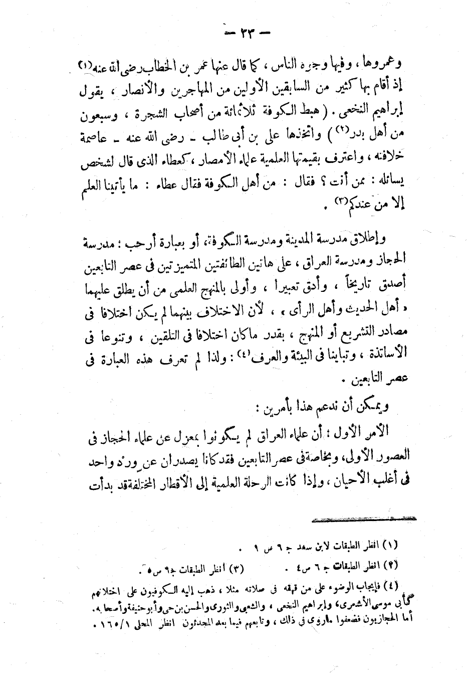 وإطلاق مدرسة المدينة ومدرسة الكوفة، أو بعبارة أرحب: مدرسة الحجاز ومدرسة العراق، على هاتين الطائفتين المتميزتين في عصر التابعين أصدق تاريخًا، وأدق تعبيرًا، وأولى بالمنهج العلمي من أن يطلق عليهما «أَهْلَ الحَدِيثِ وَأَهْلَ الرَّأْيِ»، لأن الاختلاف بينهما لم يكن اختلافًا في مصادر التشريع أو المنهج، بقدر ما كان اختلافًا في التلقين، وتنوعًا في الأساتذة، وتباينًا في البيئة والعُرف (٤): ولذا لم تعرف هذه العبارة في عصر التابعين.