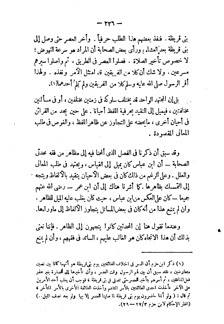 (١) ذكر ابن حزم: «أَنَّ السِّرَّ فِي اخْتِلَافِ الطَّائِفَتَيْنِ يَوْمَ بَنِي قُرَيْظَةَ هُوَ أَنَّهُمَا كَانَا بَيْنَ نَصَّيْنِ مُتَعَارِضَيْنِ، فَقَدْ سَبَقَ أَنْ بَيَّنَ لَهُمْ الرَّسُولُ وَقْتَ العَصْرِ، وَأَنَّ تَأْخِيرَهَا إِلَى الصُّفْرَةِ بِغَيْرِ عُذْرٍ فِعْلُ المُنَافِقِينَ، ثُمَّ أَمَرَهُمْ بِتَأْخِيرٍ لِلْعَصْرِ حَتَّى تُصَلَّى فِي بَنِي قُرَيْظَةَ، فَوَجَبَ أَنْ يَغْلِبَ أَحَدُ الأَمْرَيْنِ عَلَى الآخَرِ فَأَخَذَتْ إِحْدَى الطَّائِفَتَيْنِ بِالأَمْرِ المُتَقَدِّمِ وَأَخَذَتْ الطَّائِفَةُ الأُخْرَى بِالأَمْرِ المُتَأَخِّرِ»، ثم قال: «وَلَوْ أَنَّنَا حَاضِرُونَ يَوْمَ بَنِي قُرَيْظَةَ لَمَا صَلَّيْنَا العَصْرَ إِلَّا فِيهَا وَلَوْ بَعْدَ نِصْفِ اللَّيْلِ ...» (انظر " الإحكام "، لابن حزم: ٣/ ٢٧، ٢٩).