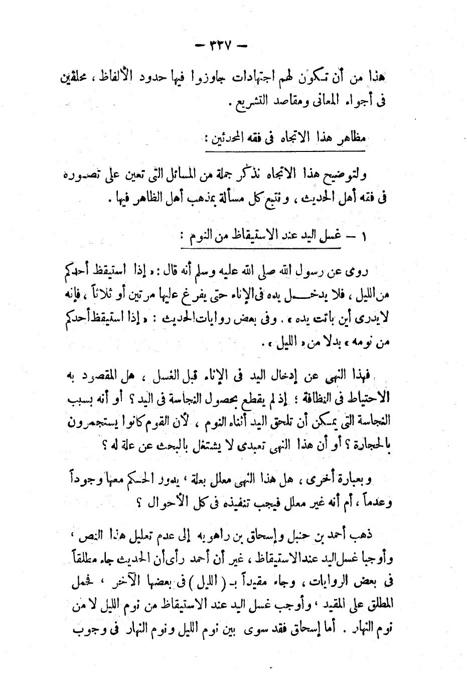 ولتوضيح هذا الاتجاه نذكر جملة من المسائل التي تعين على تصوره في فقه أهل الحديث، ونتبع كل مسألة بمذهب أهل الظاهر فيها.