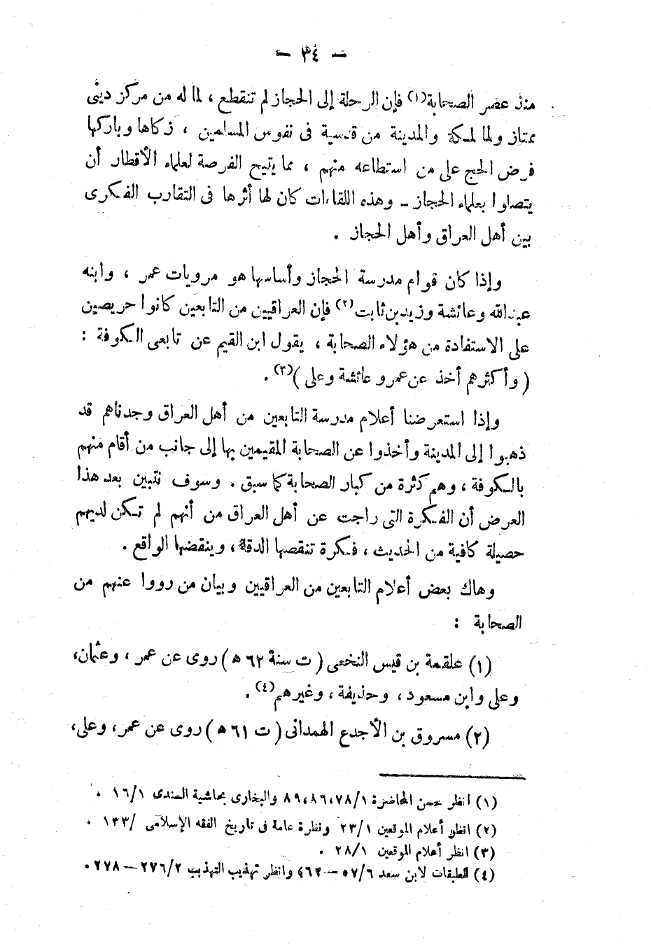 وإذا استعرضنا أعلام مدرسة التابعين من أهل العراق وجدناهم قد ذهبوا إلى المدينة وأخذوا عن الصحابة المُقيمين بها إلى جانب من أقام منهم بالكوفة، وهم كثرة من كبار الصحابة كما سبق. وسوف نتبين بعد هذا العرض أن الفكرة، وهم كثرة من كبار الصحابة كما سبق. وسوف نتبين بعد هذا العرض أن الفكرة التي راجت عن أهل العراق من أنهم لم تكن لديهم حصيلة كافية من الحديث، فكرة تنقضها الدقة، وينقضها الواقع.