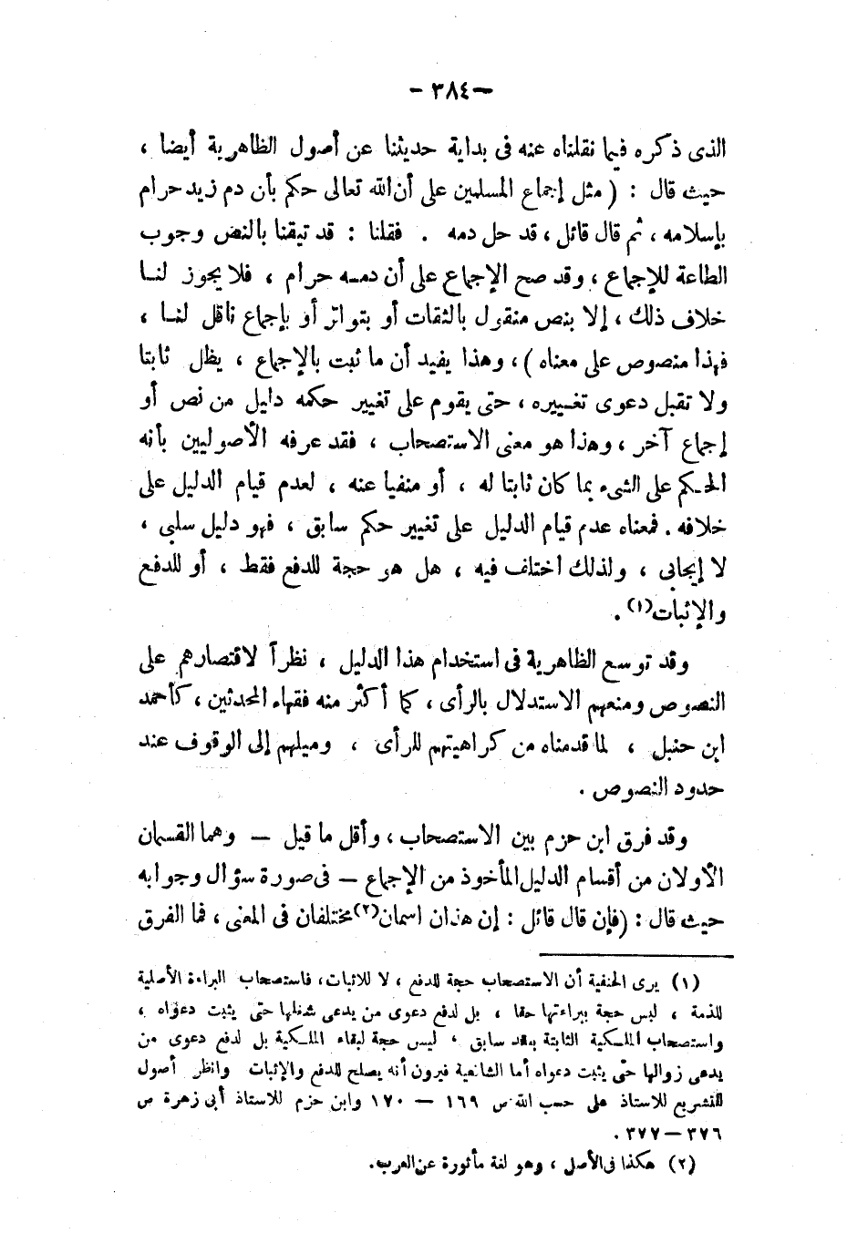 (١) يرى الحنفية أن الاستصحاب حجة للدفع، لا للإثبات، فاستصحاب البراءة الأصلية للذمة، ليس حجة ببراءتها حقًا، بل لدفع دعوى من يدعي شغلها حتى يثبت دعواه، واستصحاب الملكية الثابتة بعقد سابق، ليس حجة لبقاء الملكية بل لدفع دعوى من يدعي زوالها حتى يثبت دعواه. أما الشافعية فيرون أنه يصلح للدفع والإثبات. وانظر " أصول التشريع "، للأستاذ علي حسب الله: ص ١٦٩، ١٧٠؛ و" ابن حزم "، للأستاذ أبي زهرة: ص ٣٧٦، ٣٧٧.